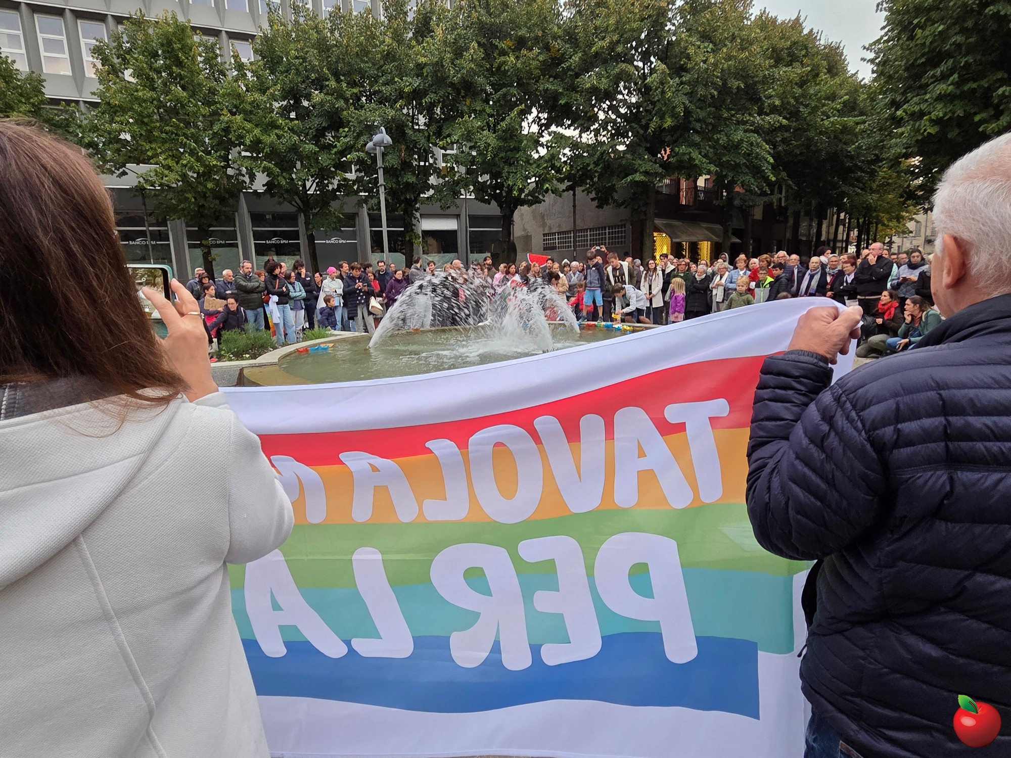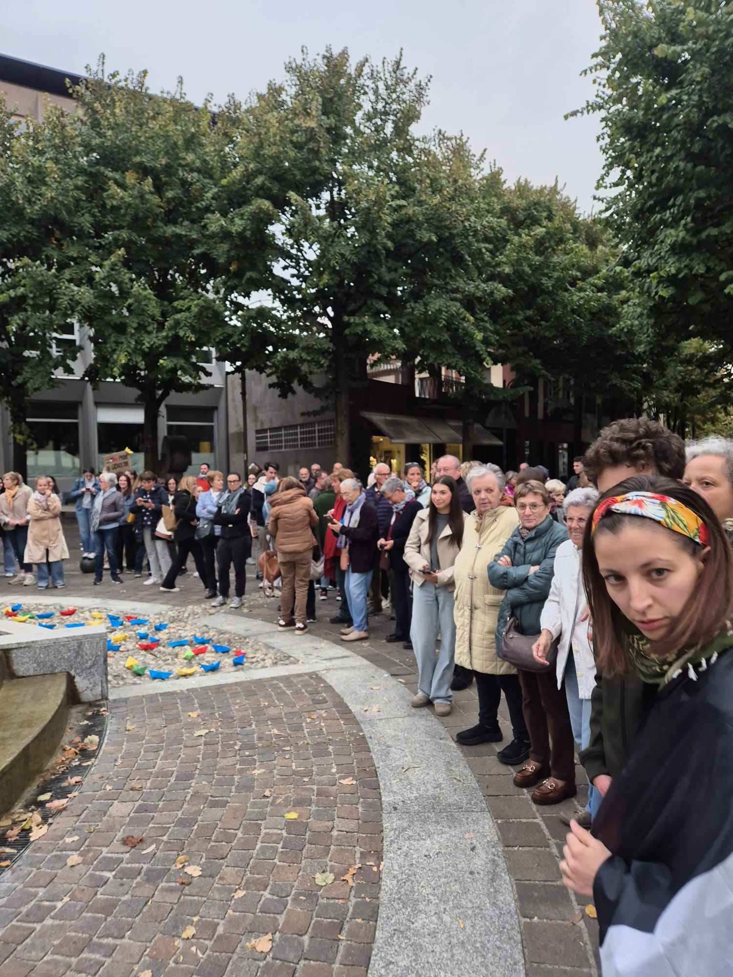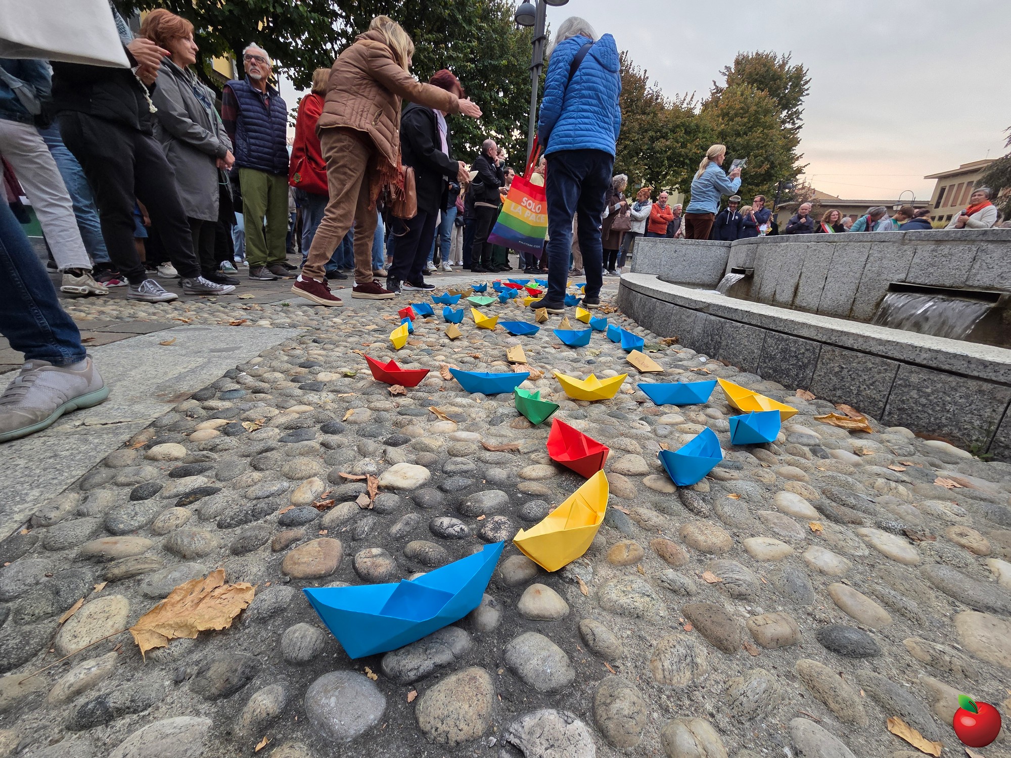 Dai bambini agli anziani, tutti si sono radunati attorno alla fontana, vista un po' come il mare che lambisce le terre del massacro, e qui con striscioni e barche colorate di carta, poi adagiate sull'acqua, hanno detto il loro no alla guerra e al ritorno a un dialogo costruttivo per un cessate il fuoco duraturo.