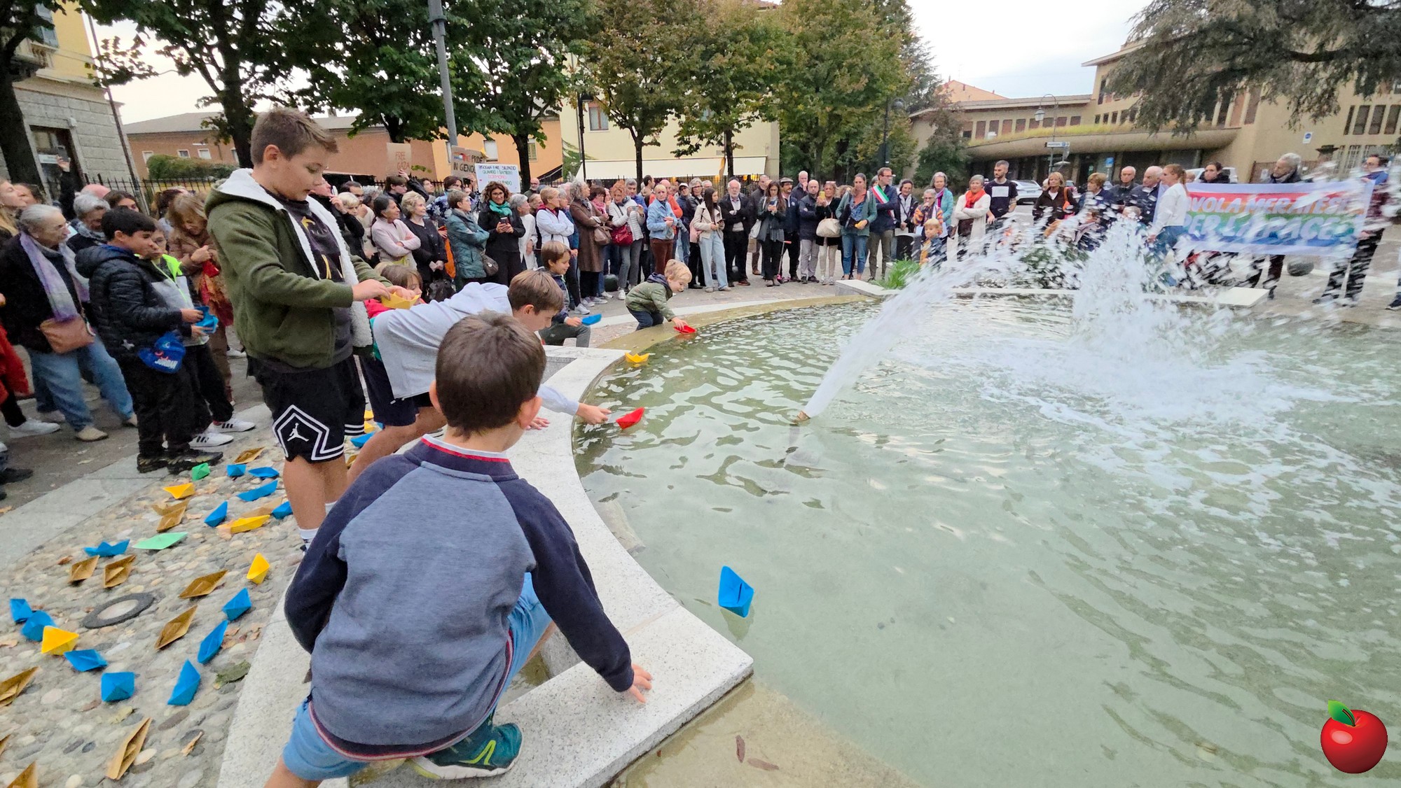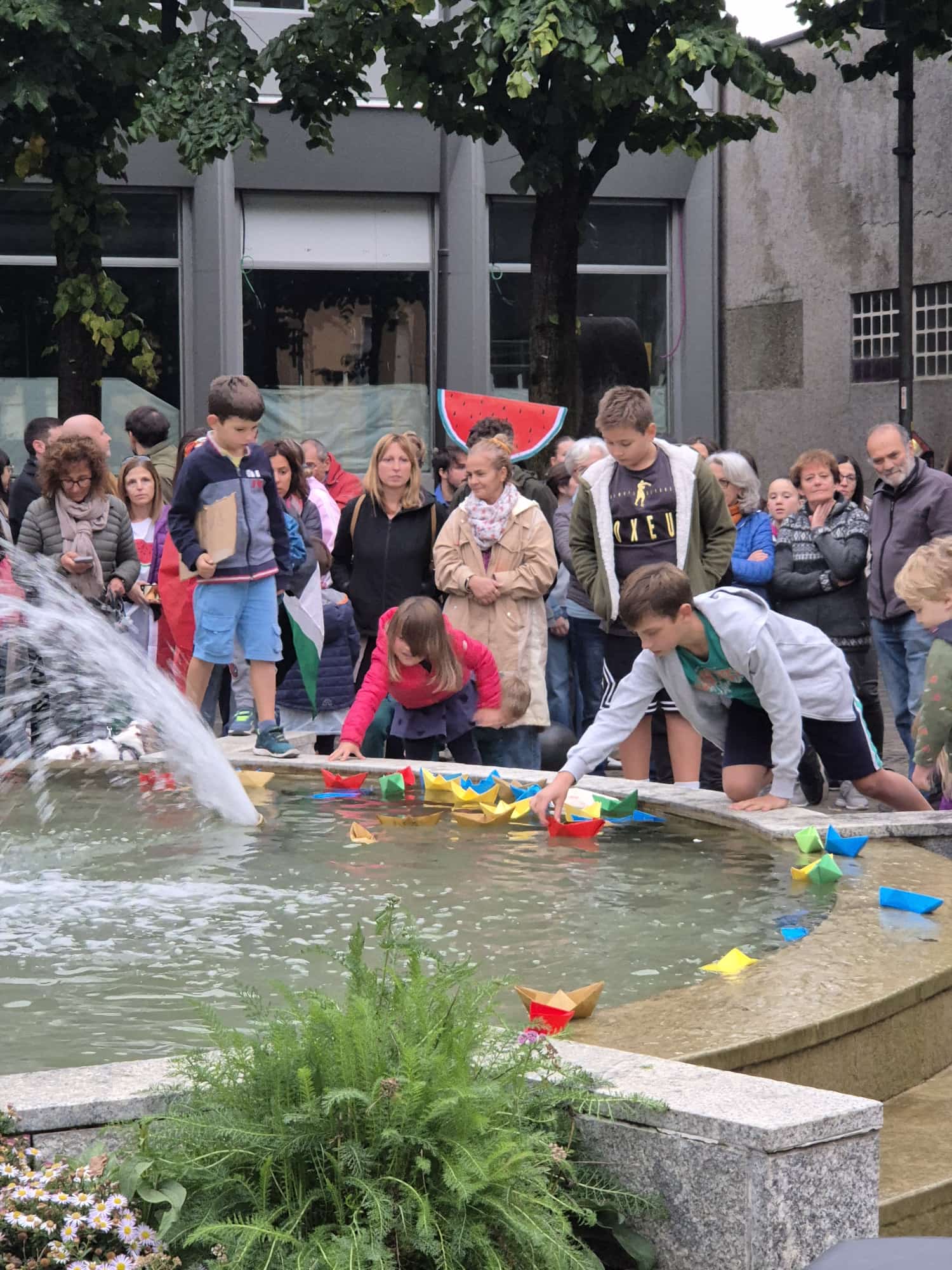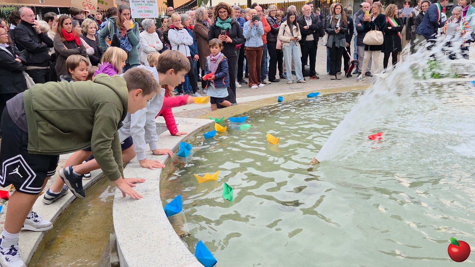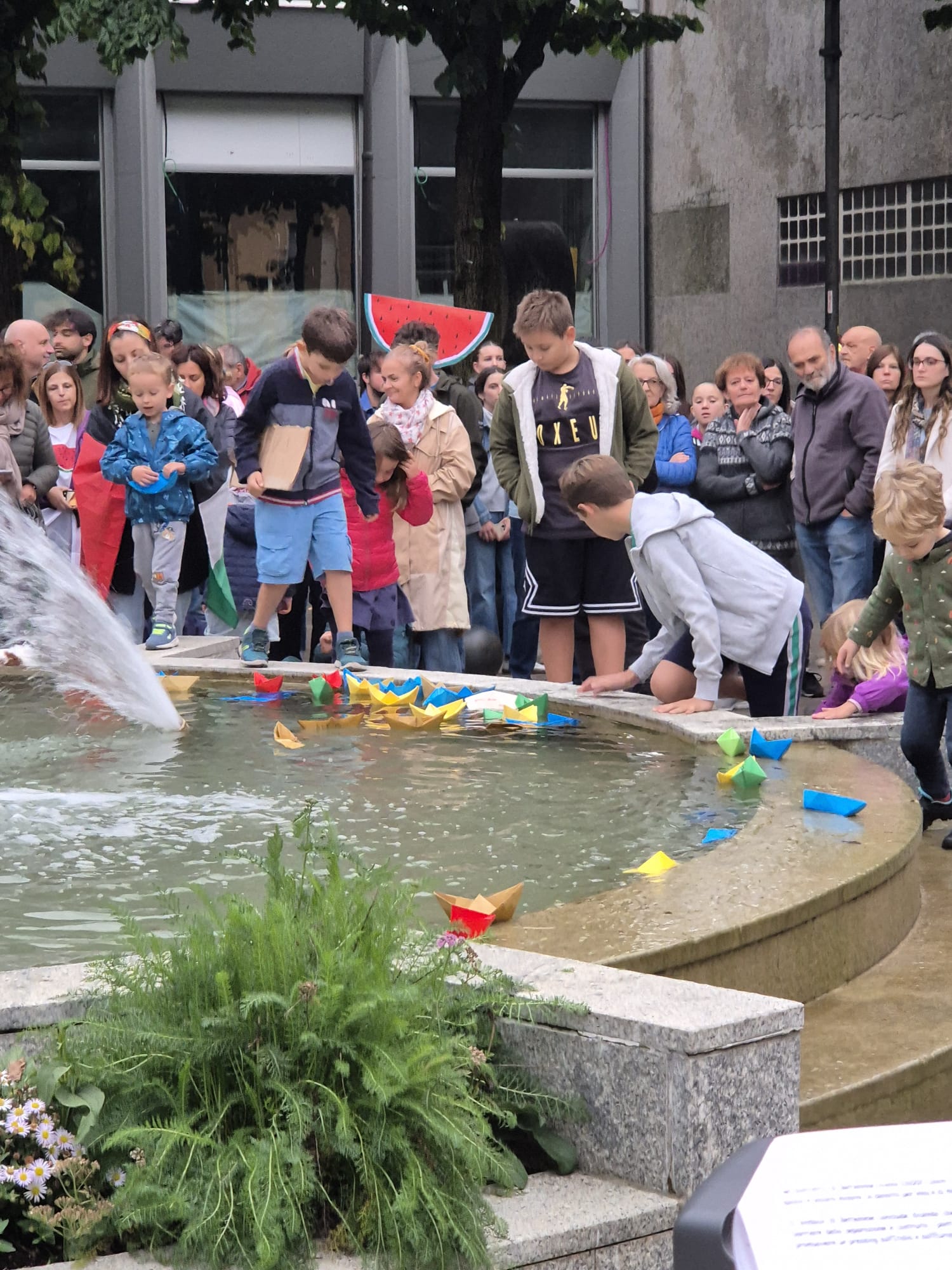 Contestualmente i tanti bambini presenti sono stati invitati a prendere le barchette di carta adagiate davanti alla fontana a formare la scritta GAZA e a lasciarle fluttuare nell'acqua.
