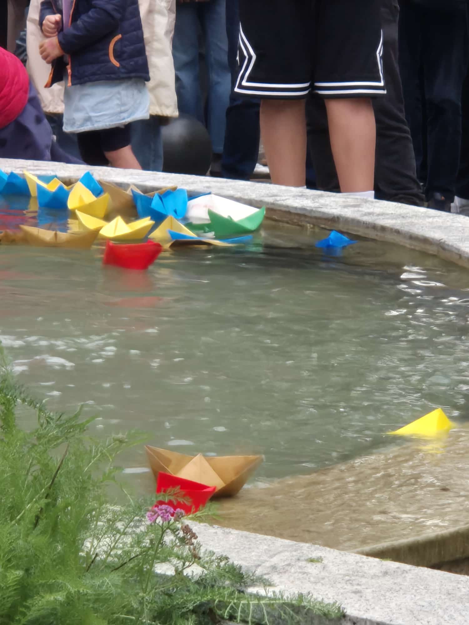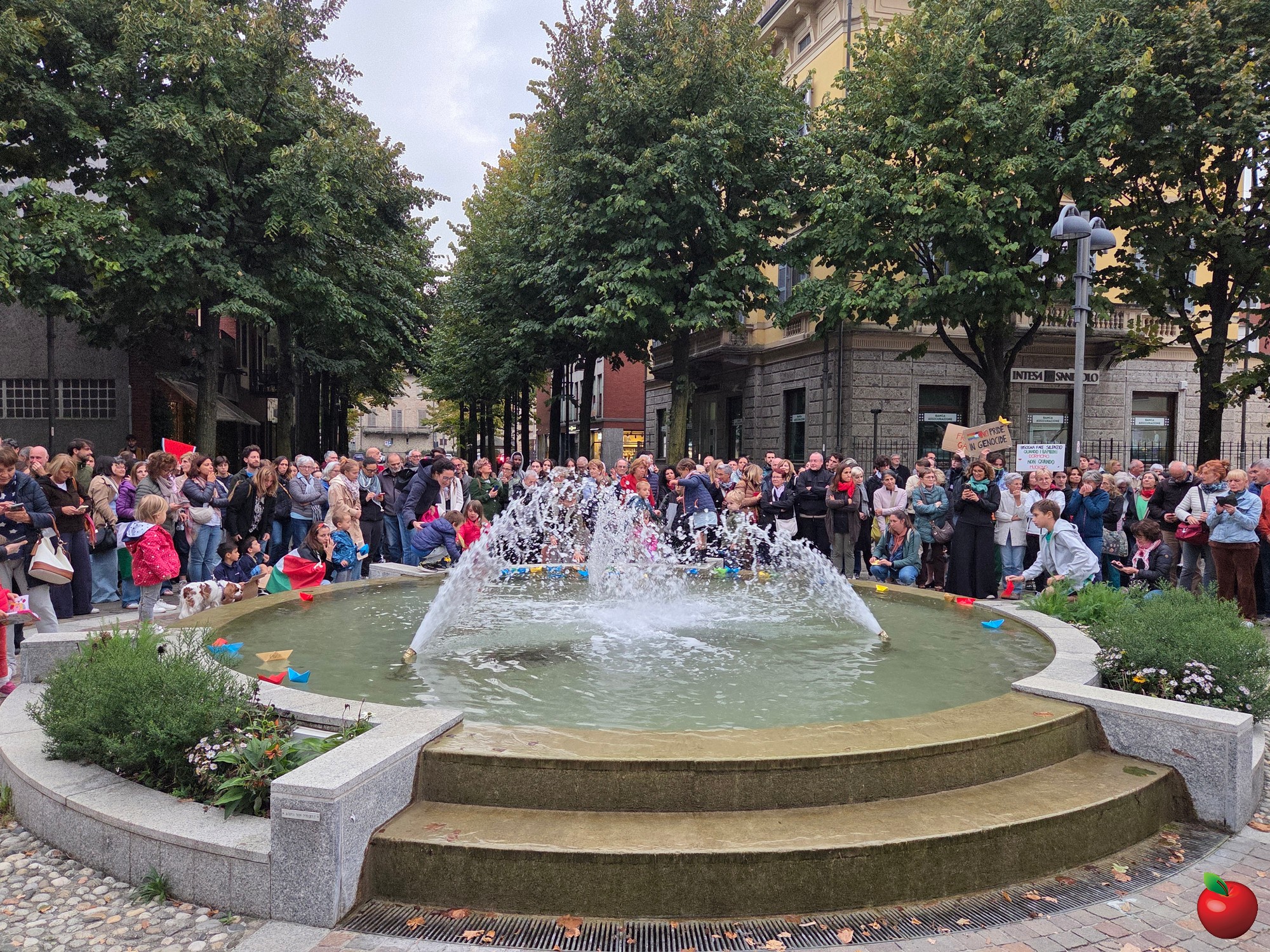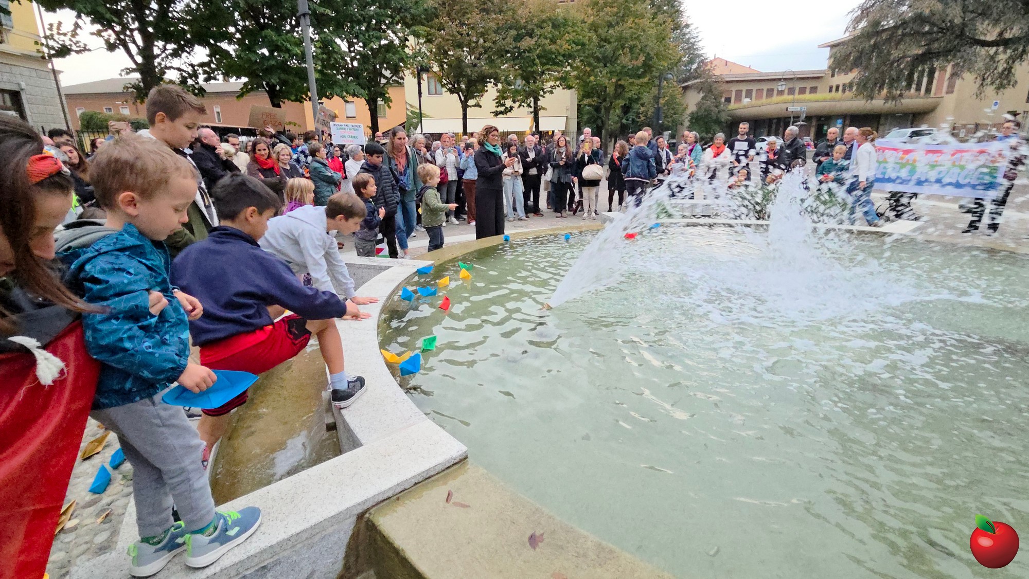 Contestualmente i tanti bambini presenti sono stati invitati a prendere le barchette di carta adagiate davanti alla fontana a formare la scritta GAZA e a lasciarle fluttuare nell'acqua.