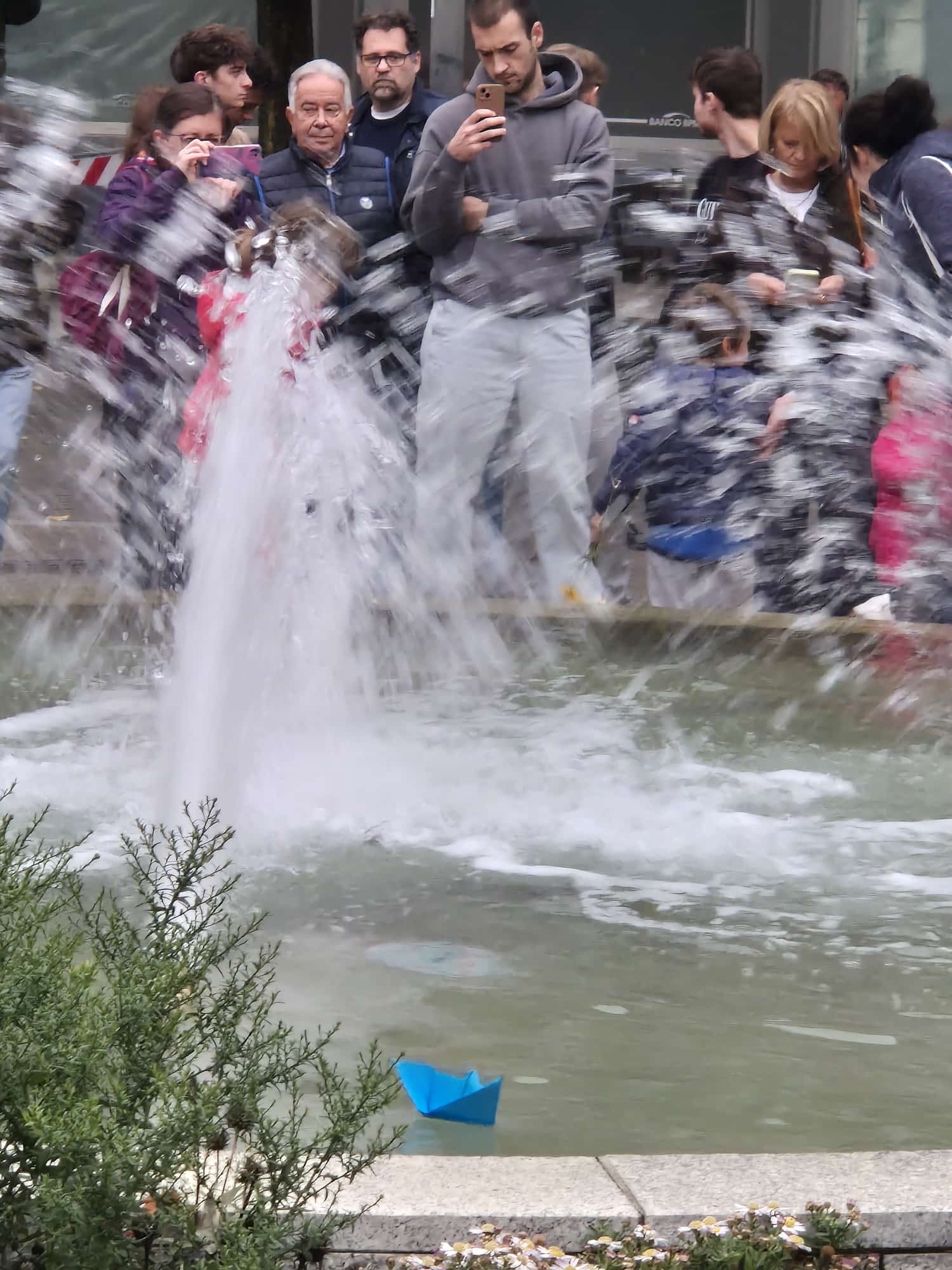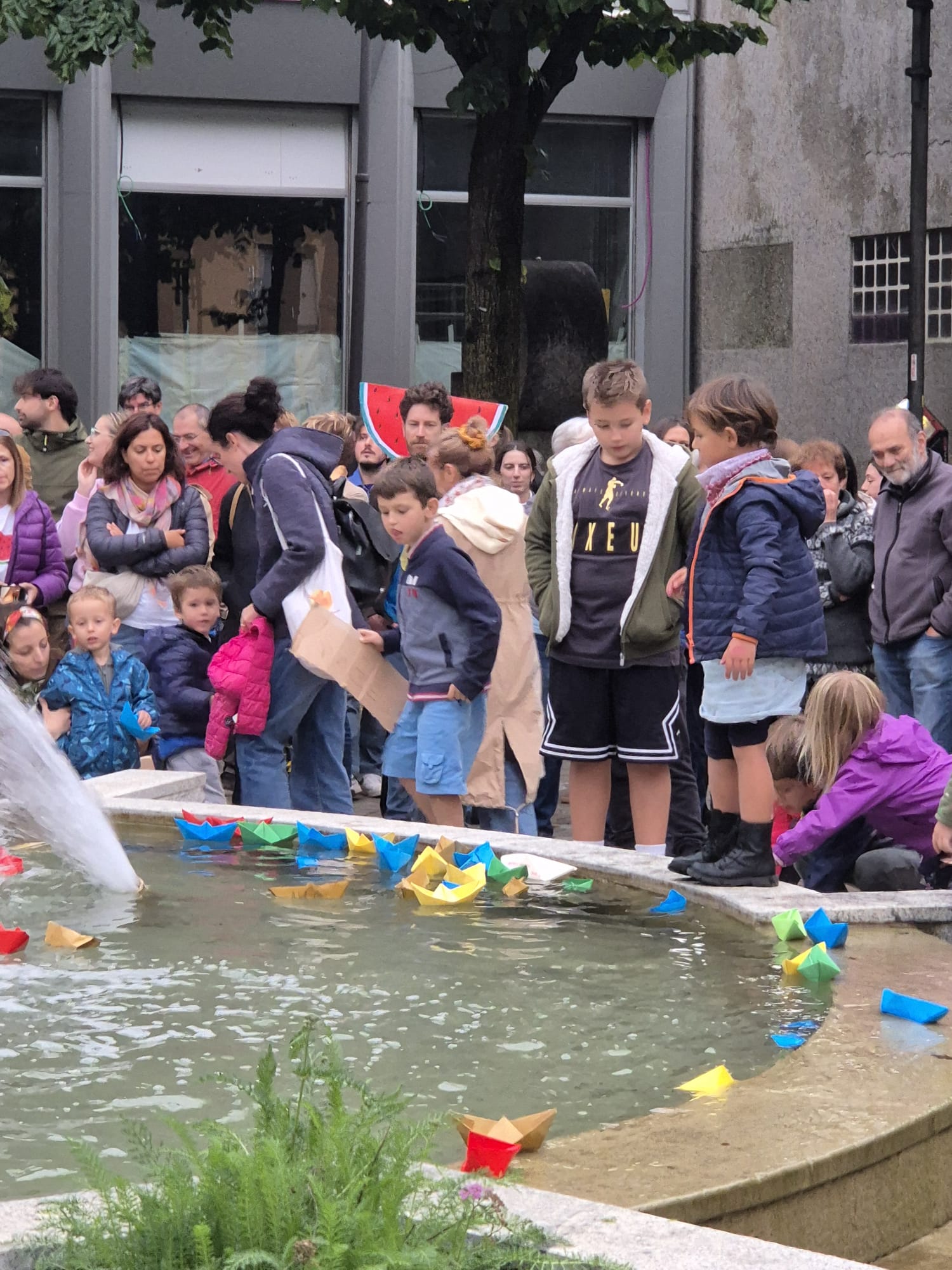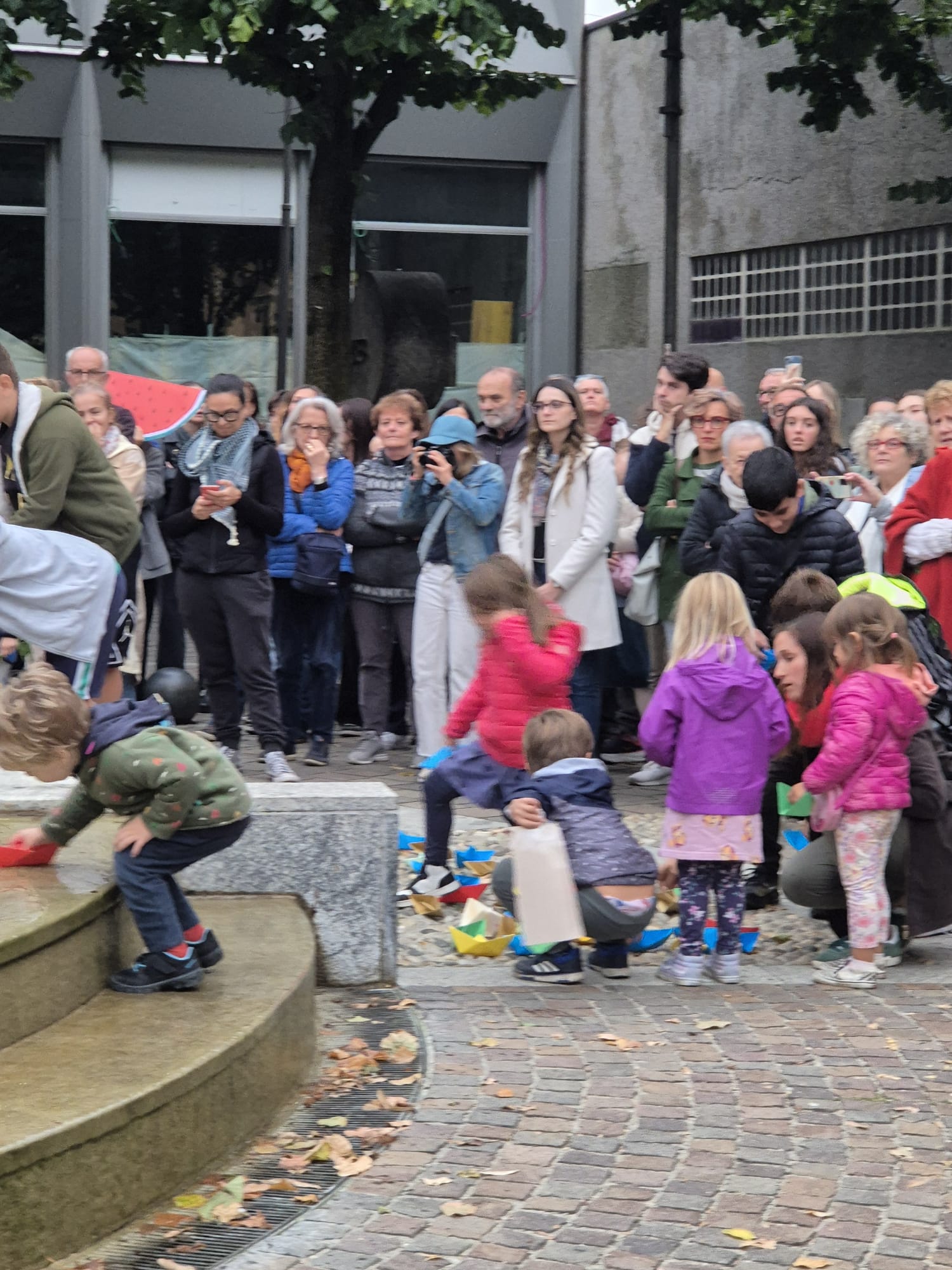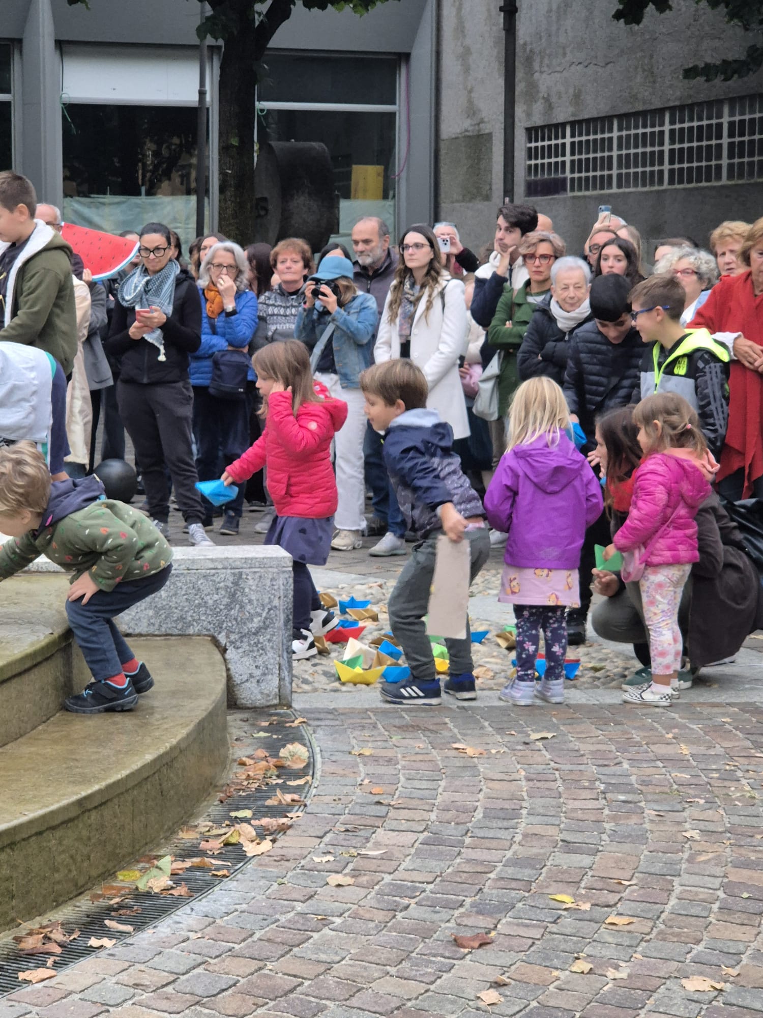 Contestualmente i tanti bambini presenti sono stati invitati a prendere le barchette di carta adagiate davanti alla fontana a formare la scritta GAZA e a lasciarle fluttuare nell'acqua.