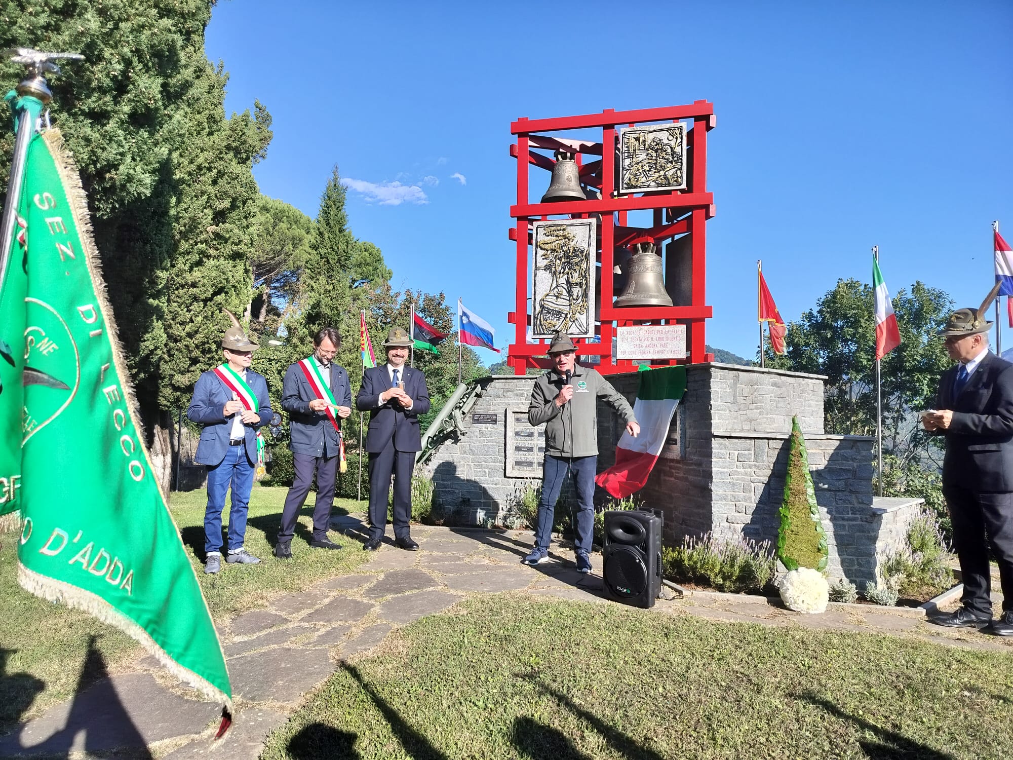Da lì, la sfilata è proseguita verso uno dei luoghi più simbolici di Paderno, il Monumento degli Alpini: un’area suggestiva che si affaccia sul fiume Adda, sormontata dalle campane che ogni giorno suonano il Padre nostro alle 10 e il Silenzio ai Caduti alle 21. È qui che si sono tenuti i discorsi ufficiali, in un momento di profonda riflessione collettiva.