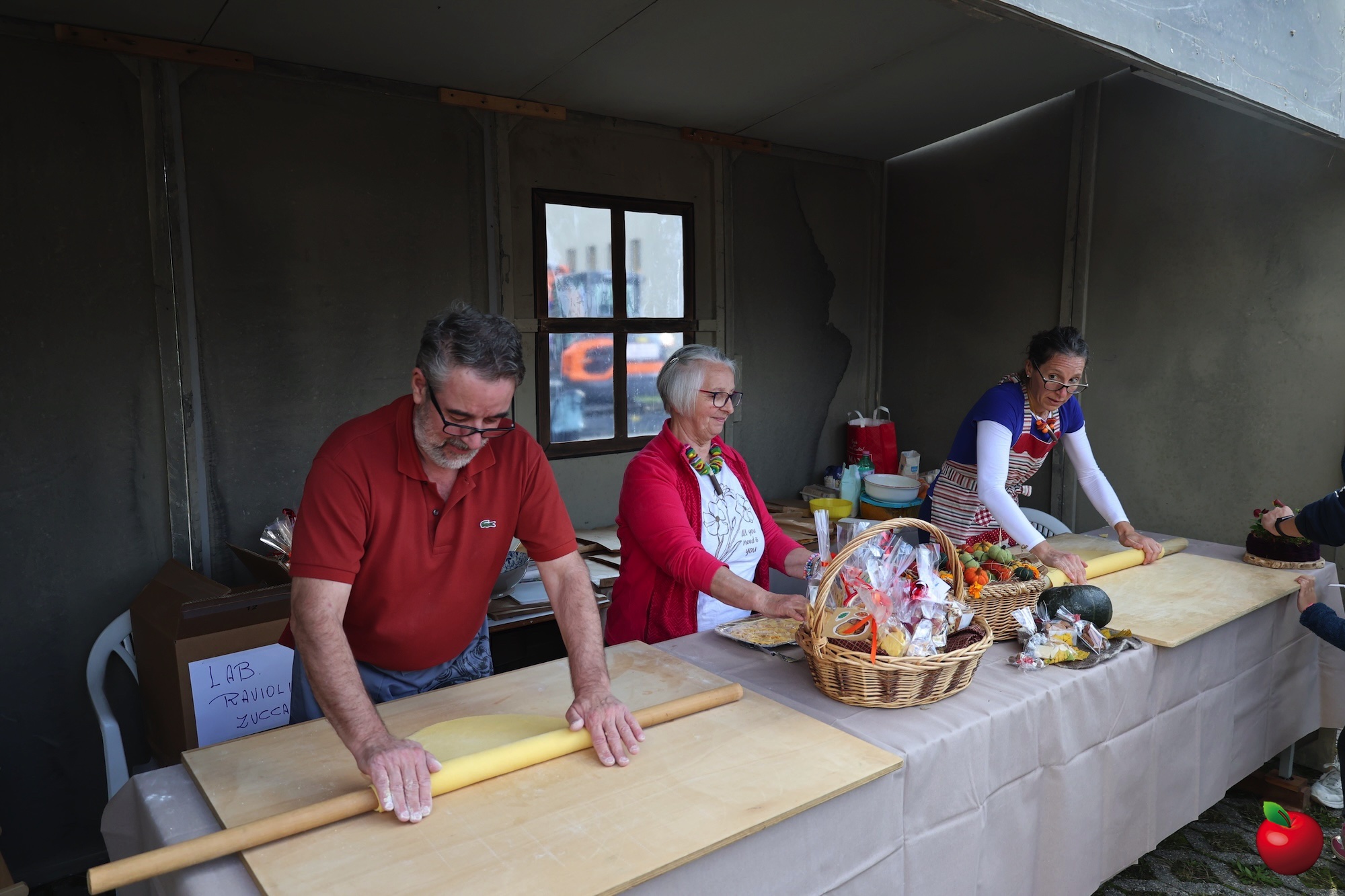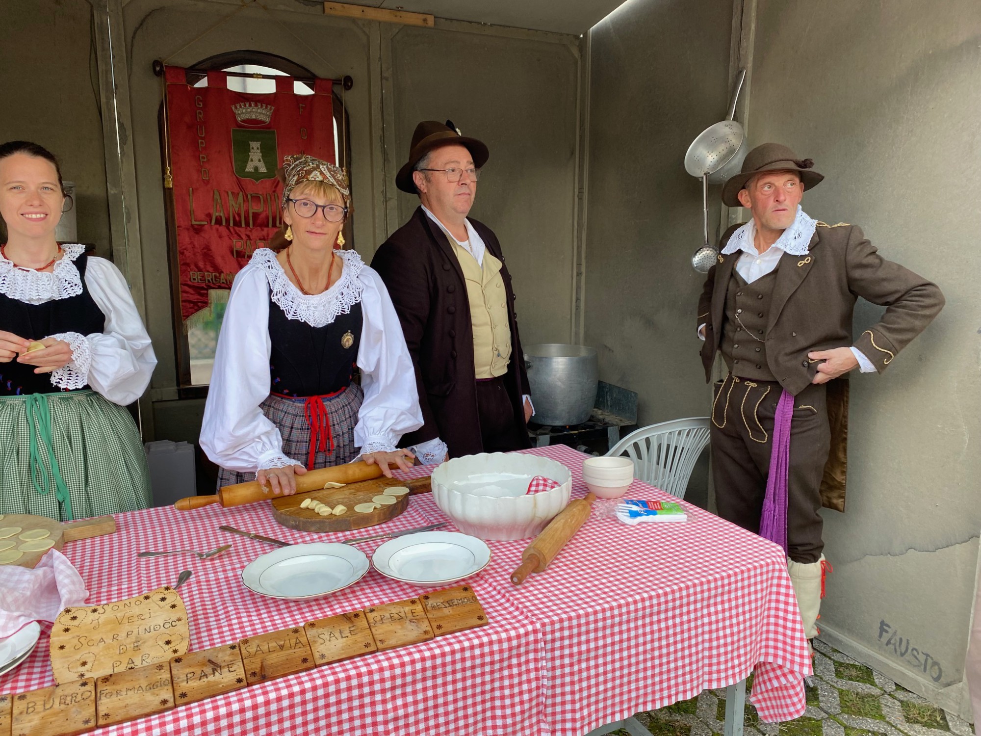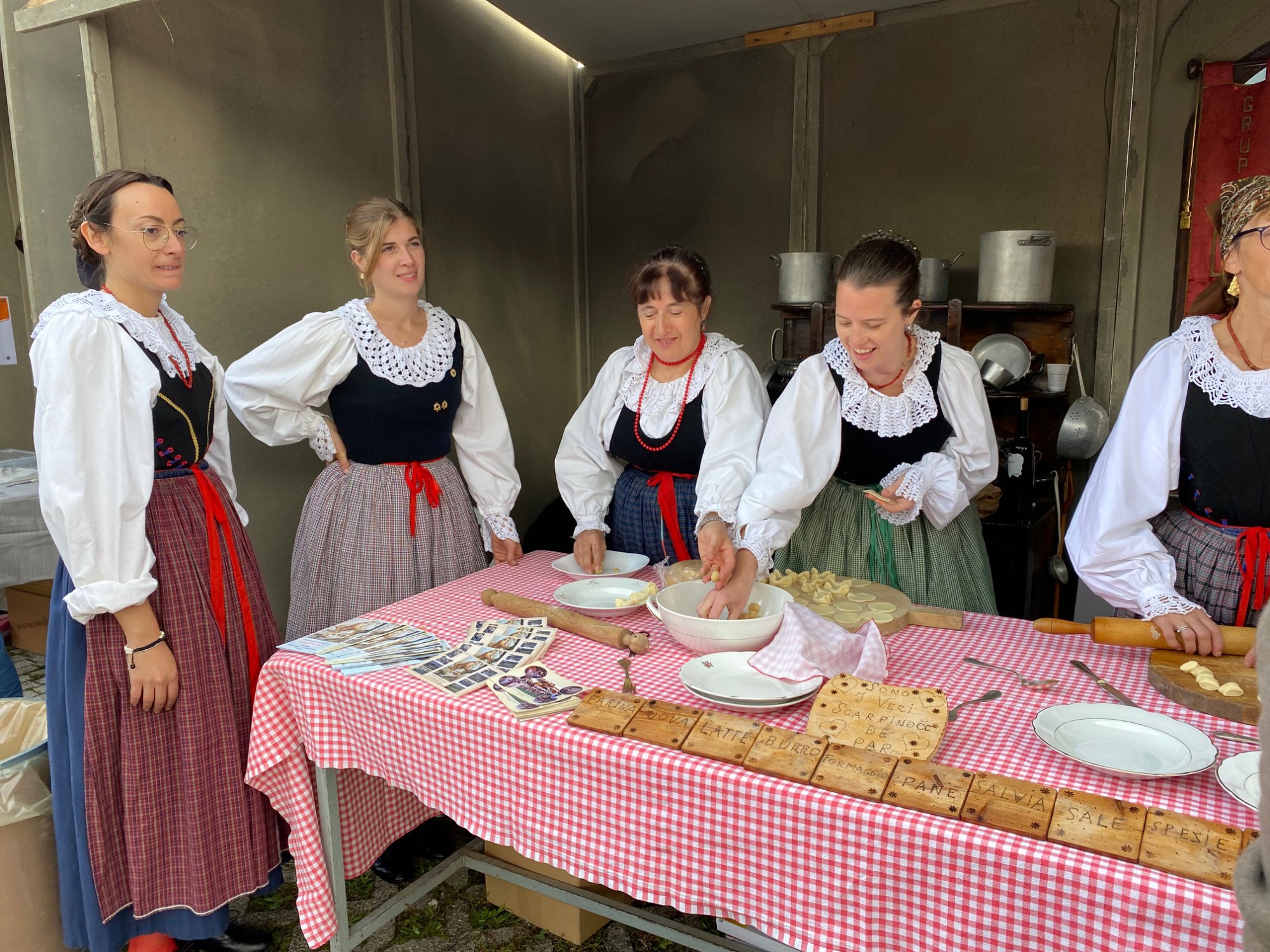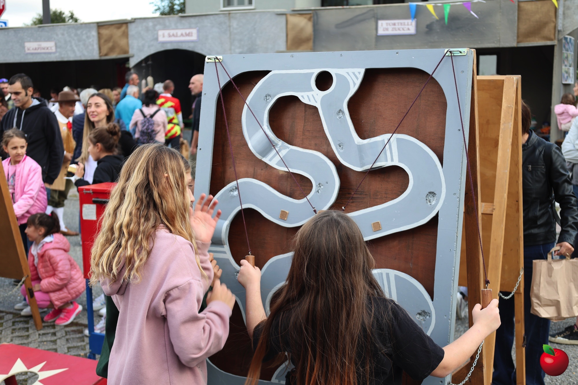 Il parcheggio di via San Gottardo si è trasformato in un vero e proprio palcoscenico a cielo aperto, dove antichi mestieri, giochi d’altri tempi, profumi e suoni si sono intrecciati in un’atmosfera unica. Ai piedi della chiesa romanica, numerosi stand hanno accolto visitatori e curiosi con dimostrazioni pratiche. I volontari e gli artigiani, con grande passione, hanno mostrato come si prepara la pasta fatta a mano, come si batte il ferro o si intaglia il legno, e ancora come si dipinge, si lavorano gli insaccati o si costruiscono flauti artigianali.