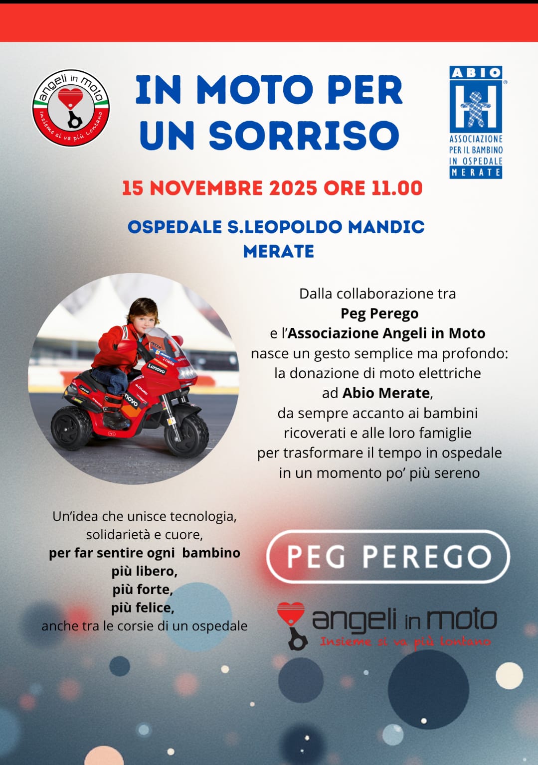 Dalla collaborazione tra Peg Perego e gli Angeli in moto nasce l’Evento “IN MOTO PER UN SORRISO”, un gesto semplice ma profondo, la donazione di queste moto elettriche ad ABIO Merate, da sempre accanto ai bambini ricoverati ed alle loro famiglie per trasformare il tempo in ospedale in un momento più sereno.