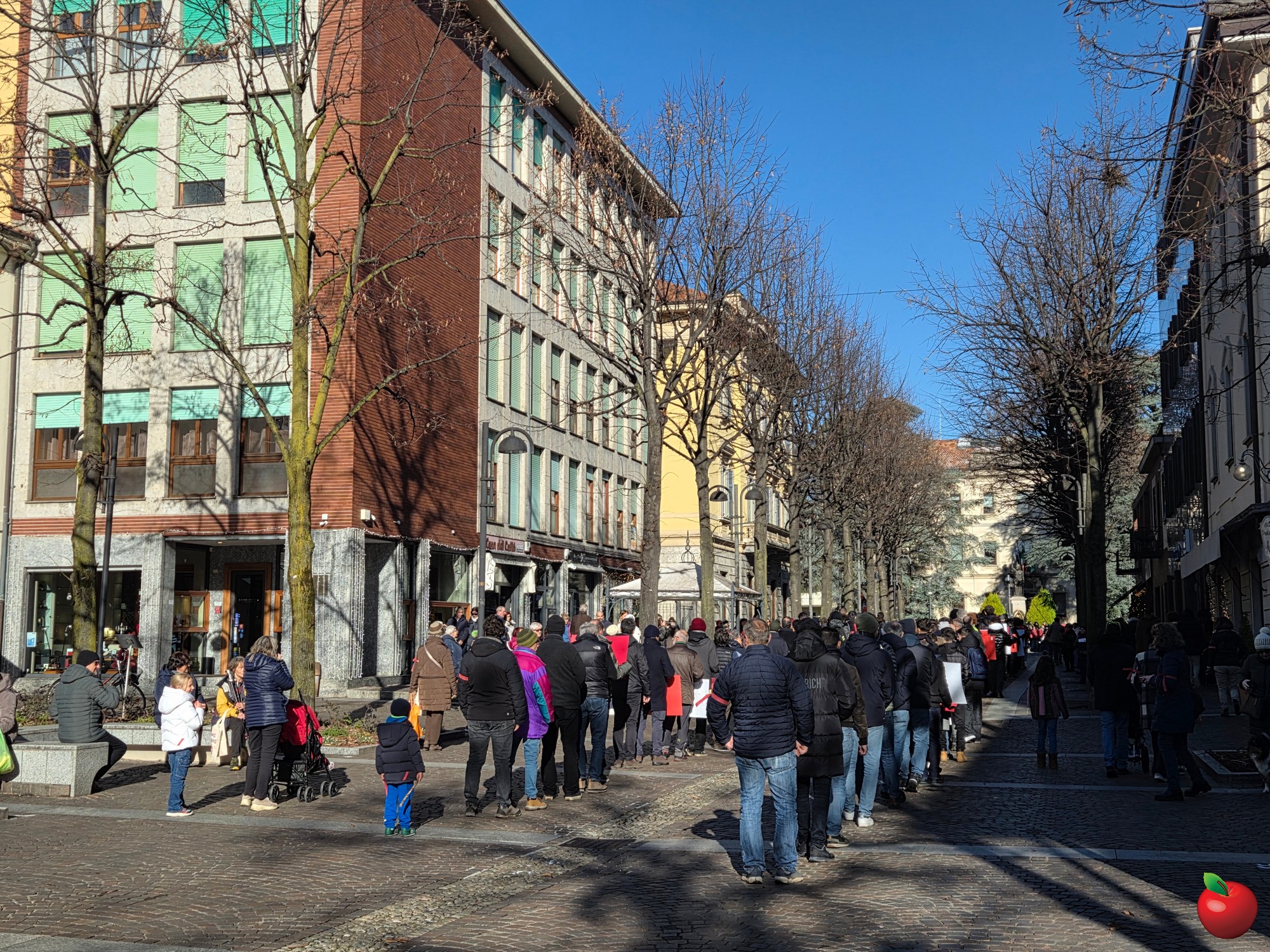 Due lunghe file parallele, partite dai piedi del castello, hanno marciato con sottofondo il suono dei tamburi, attraversando piazza Prinetti, via Carlo Baslini per approdare in piazza degli Eroi dove si sono disposti ad “abbracciare” la fontana.