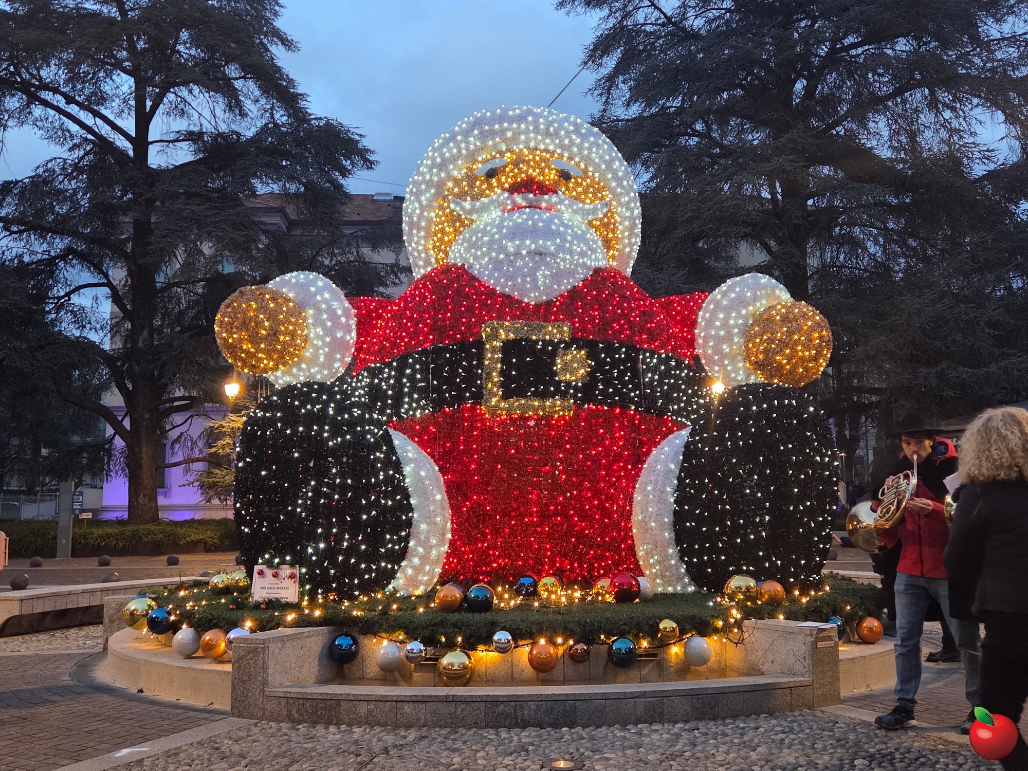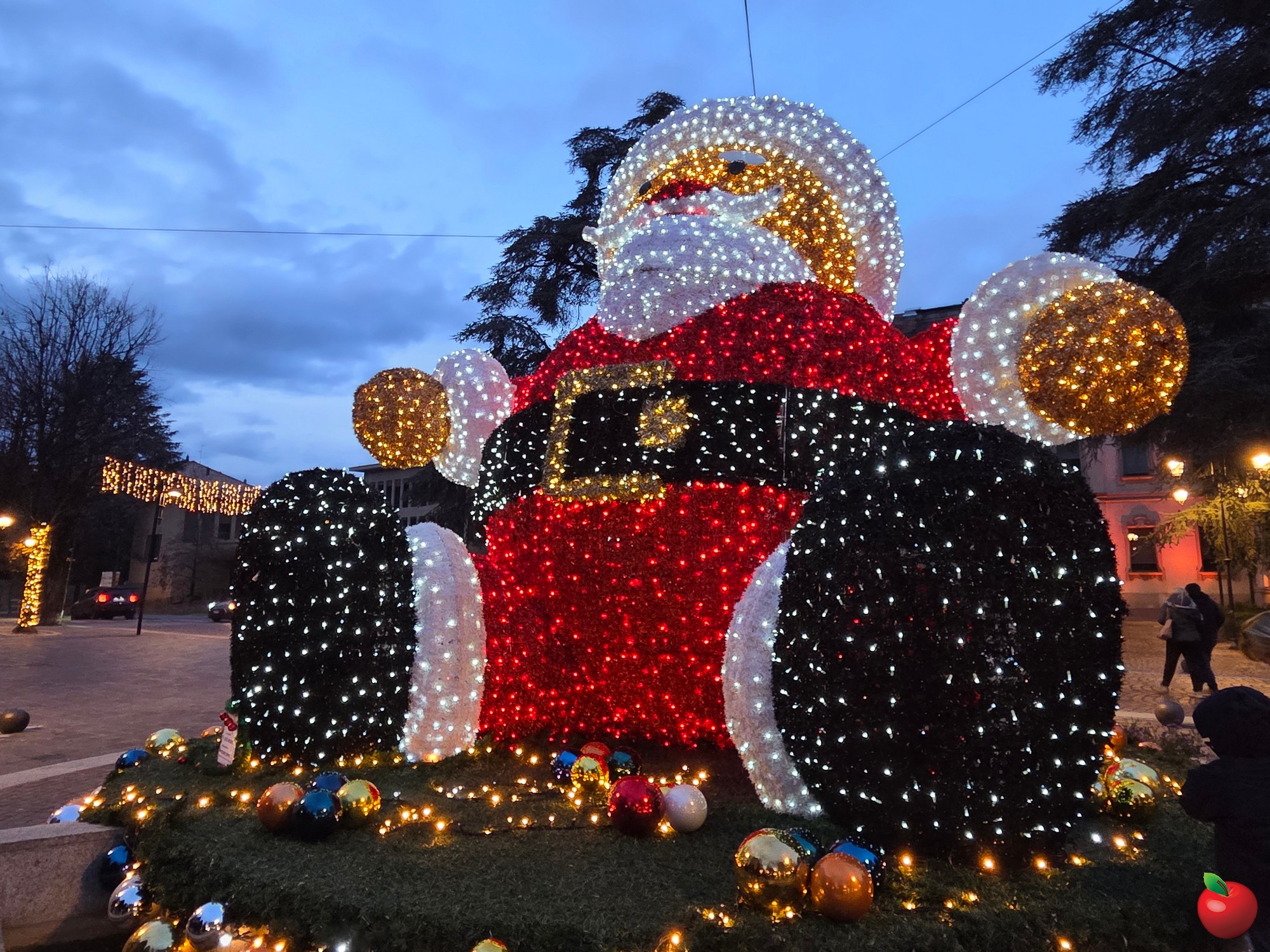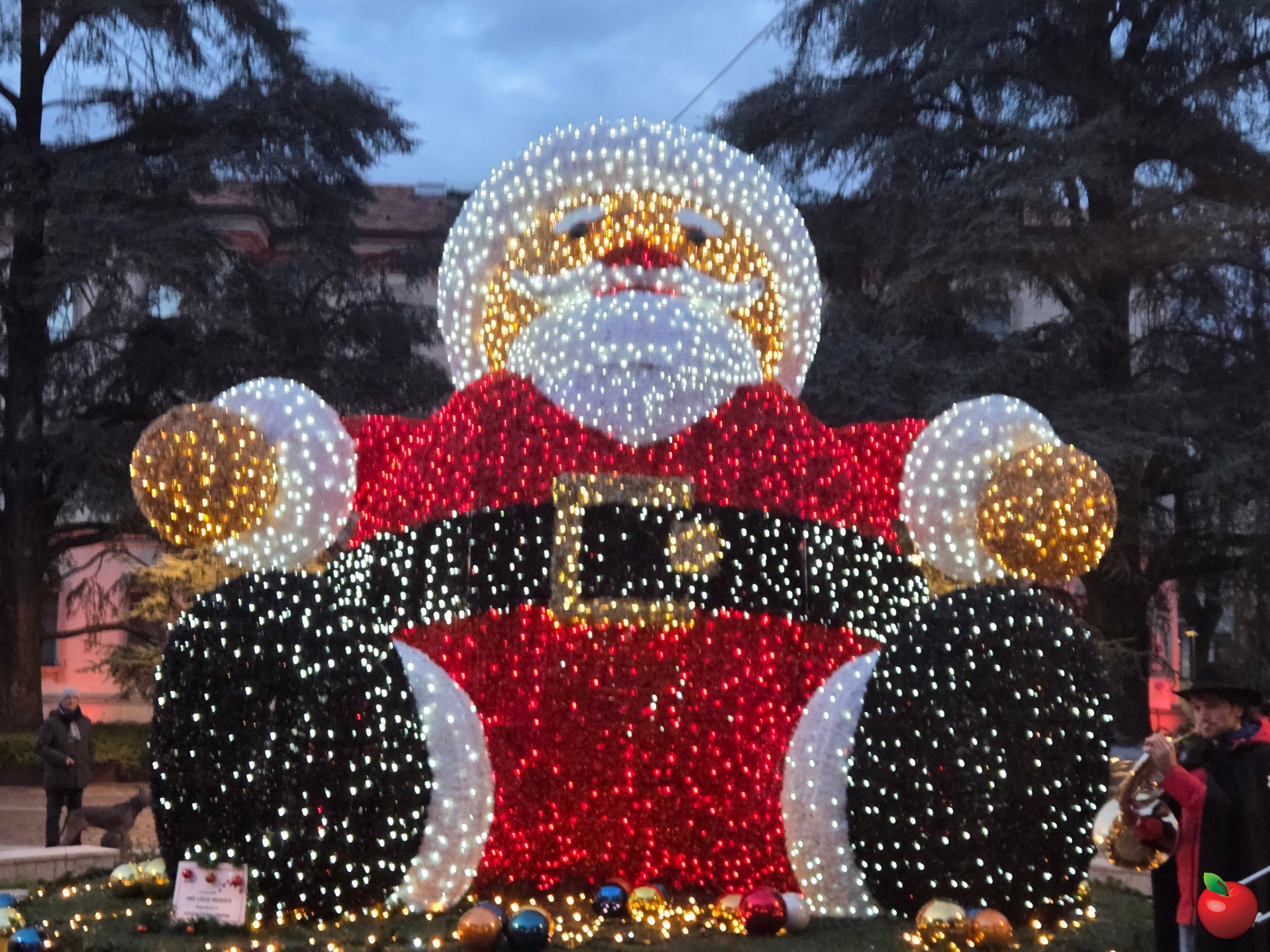 L'enorme Babbo Natale, appollaiato sulla fontana di piazza degli eroi, a coprire interamente la visuale del municipio, ha fatto la gioia dei più piccoli che sono rimasti a bocca aperta nel vedere il grande nonno con la barba bianca e il vestito rosso seduto davanti a loro, in posa per una fotografia.