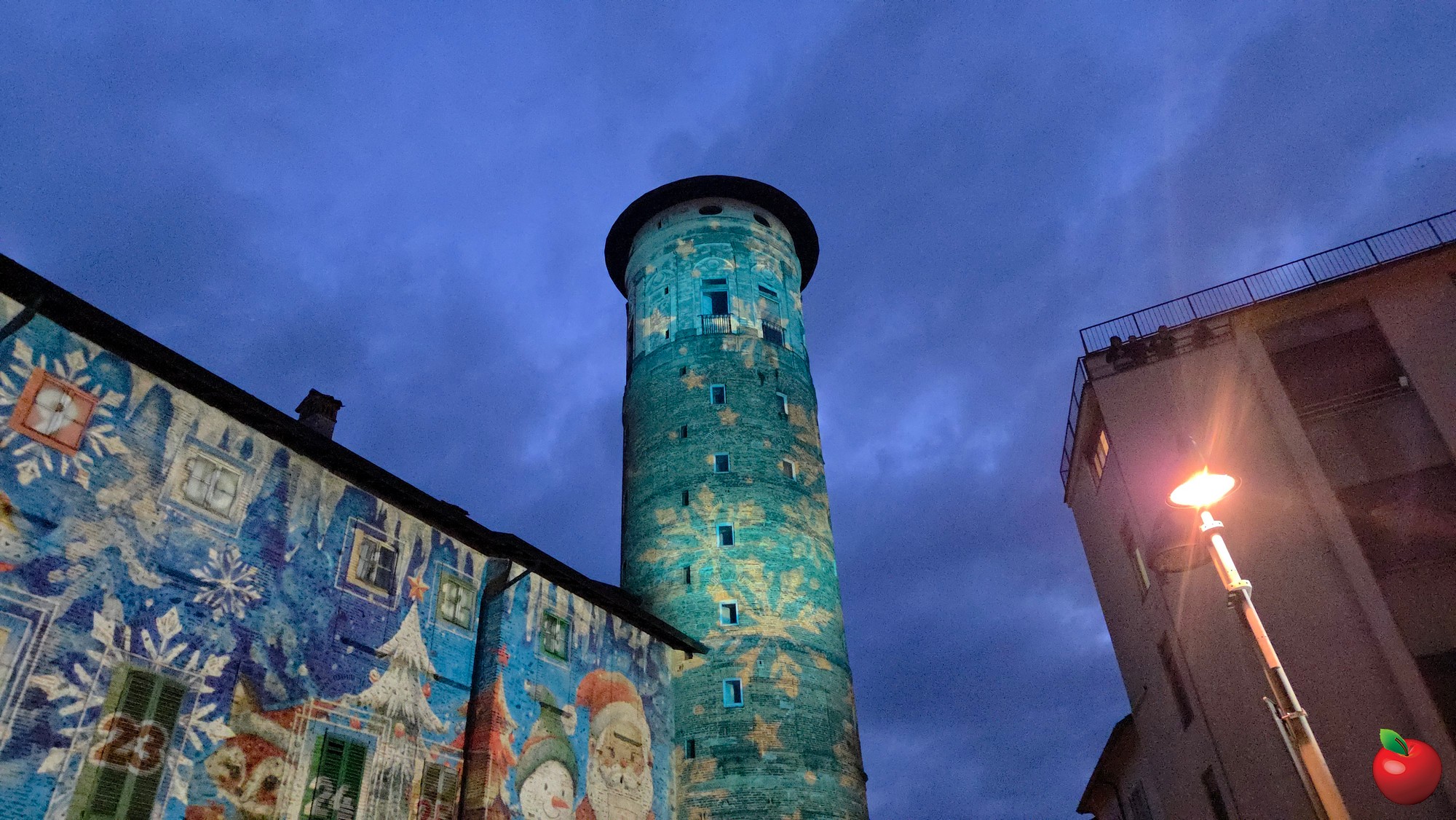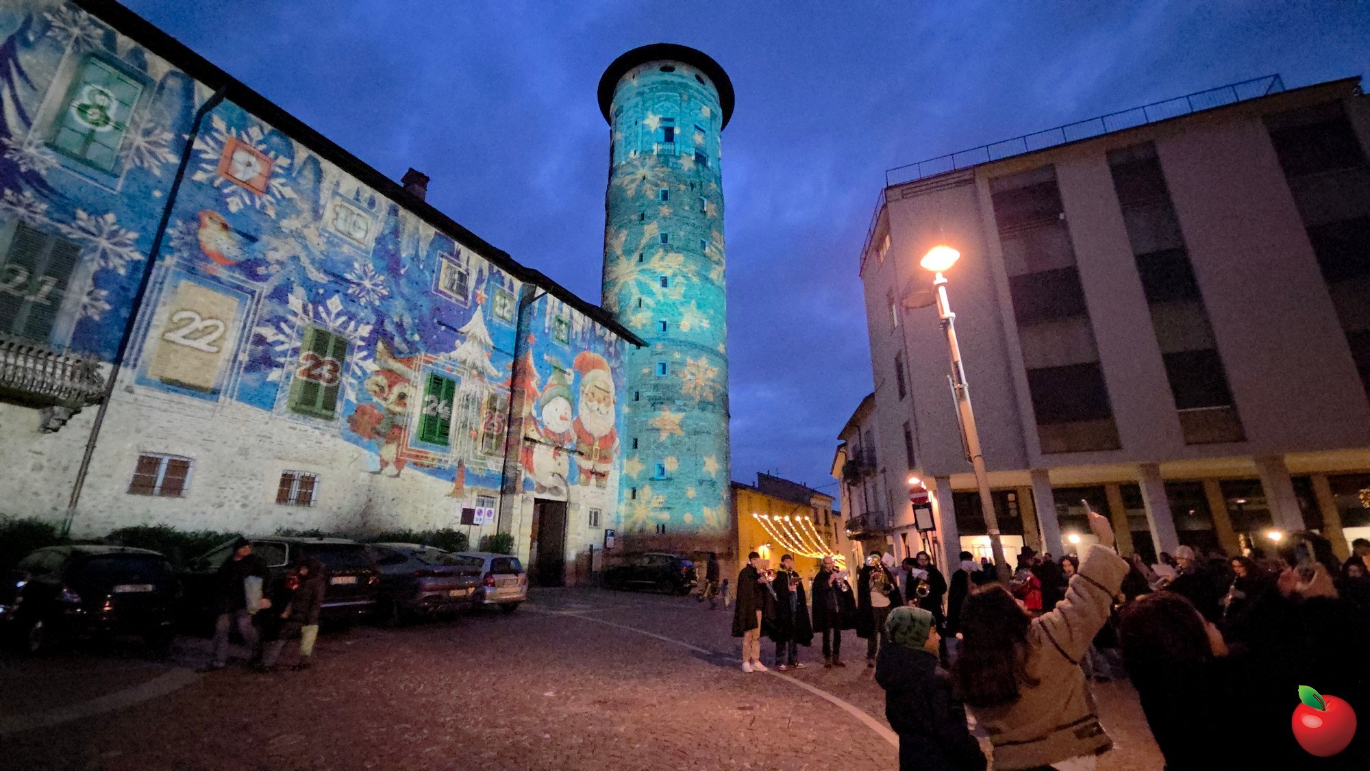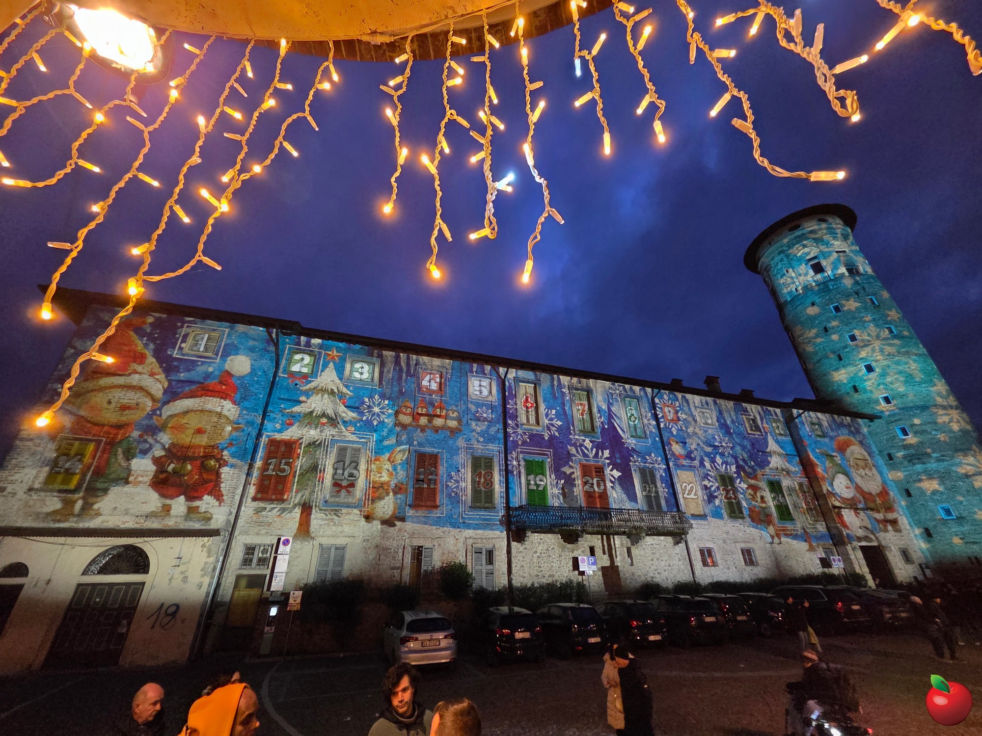 Da una parte il castello con la torre che incarna uno dei simboli più iconici della città di Merate. All'estremo opposto, nell'altra piazza, un enorme Babbo Natale, raffigurazione per grandi e piccini di questo periodo di festa, di scambio di doni e di allegria.