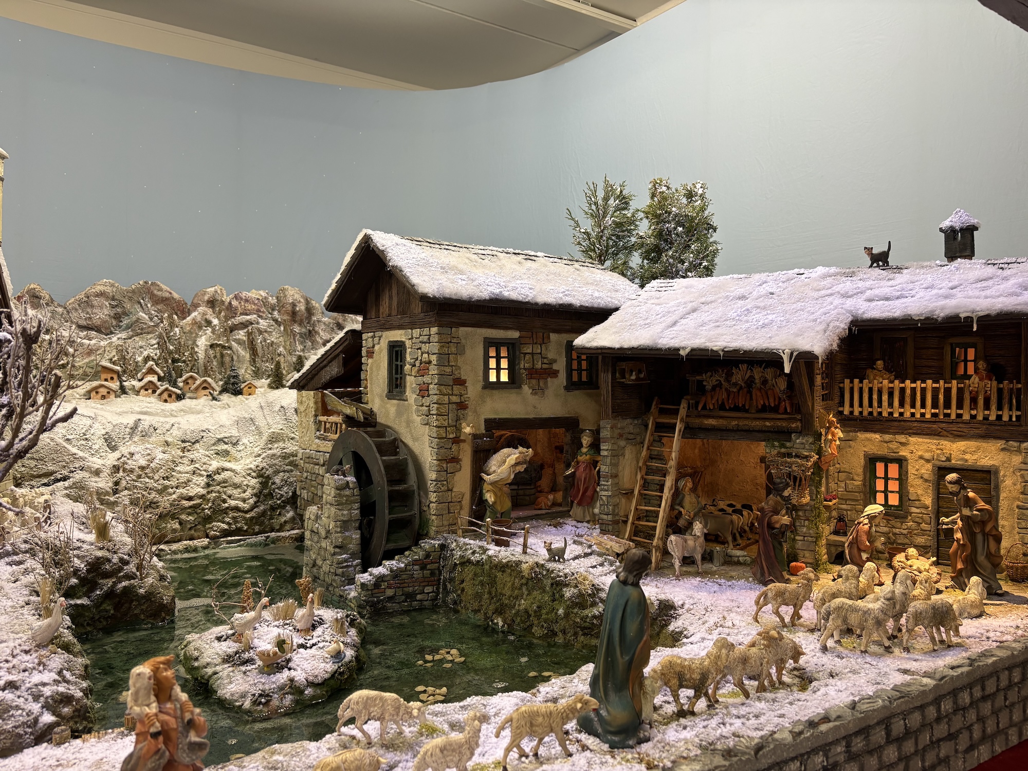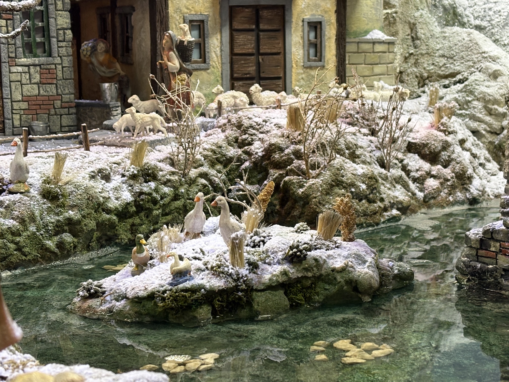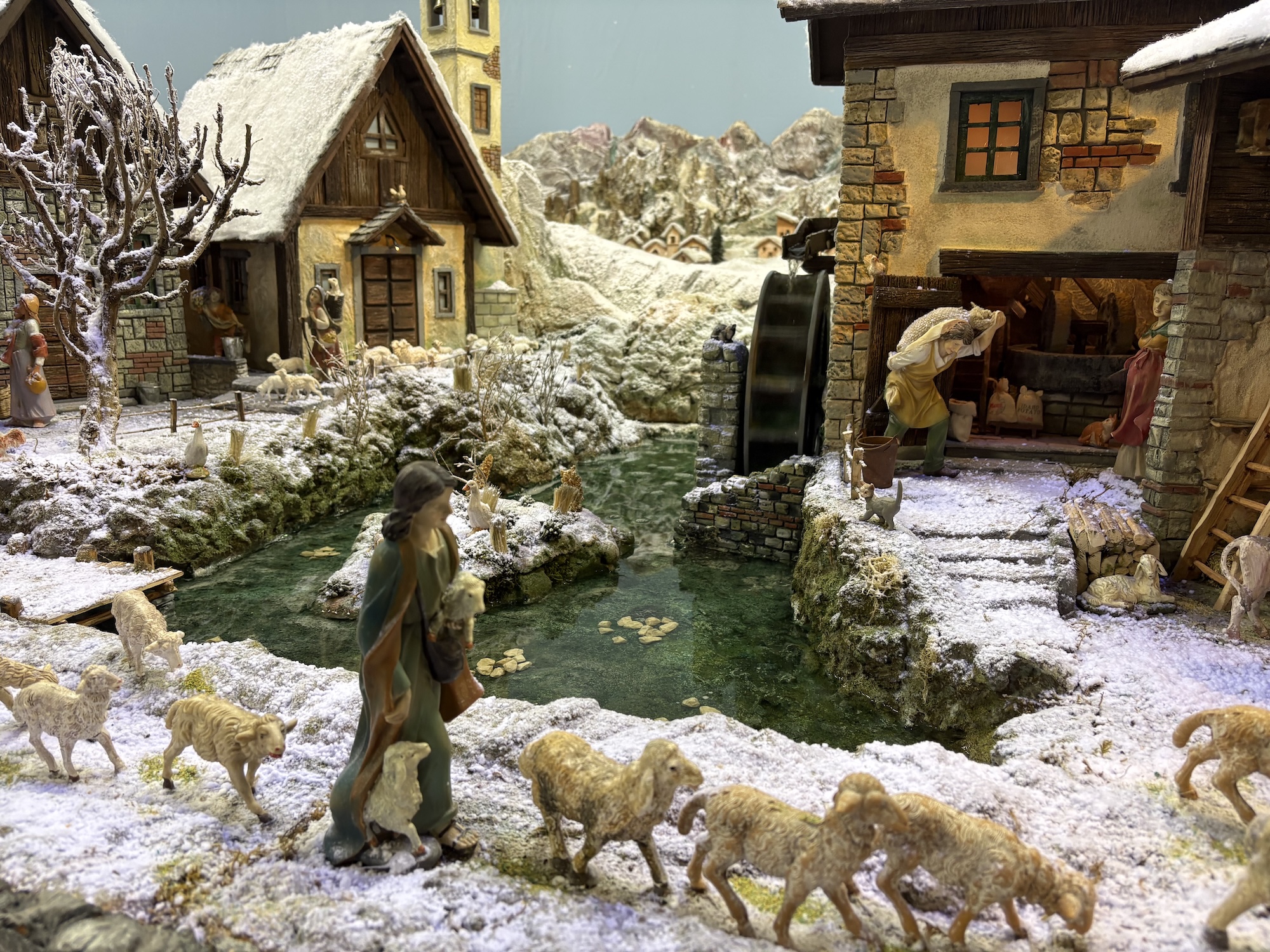 Come da tradizione, ogni anno il presepe cambia completamente. Ogni dettaglio è frutto di studio, pazienza e passione: i mattoni delle case vengono incisi o incollati uno a uno, poi dipinti e sfumati per dare profondità e segni di usura. Lo sfondo verde dello stagno crea un gioco di riflessi capace di conferire profondità visiva all’intero paesaggio. Tra gli elementi più affascinanti spiccano la ruota del mulino e la macina, entrambe funzionanti grazie alla sola forza dell’acqua, messa in movimento da una pompa.