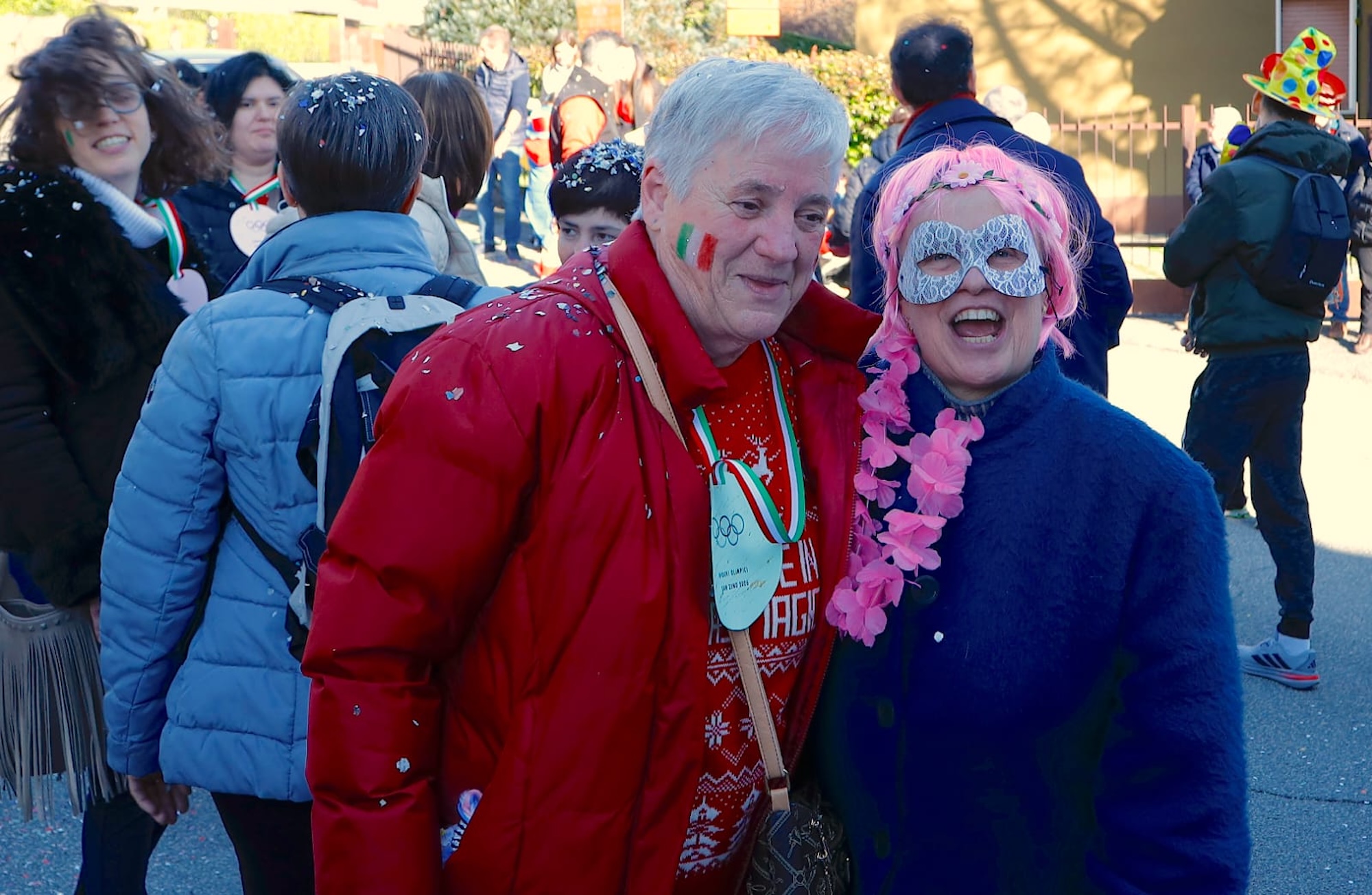 Grandi e piccoli si sono ritrovati per dare il via alla sfilata, animata da un suggestivo paesaggio innevato allestito sul carro, tra sci e i cinque cerchi olimpici ben visibili. A guidare simbolicamente il corteo è stato don Giancarlo nei panni della fiamma olimpica che, seguito da bambini e famiglie in maschera, ha dato il via alla festa.
