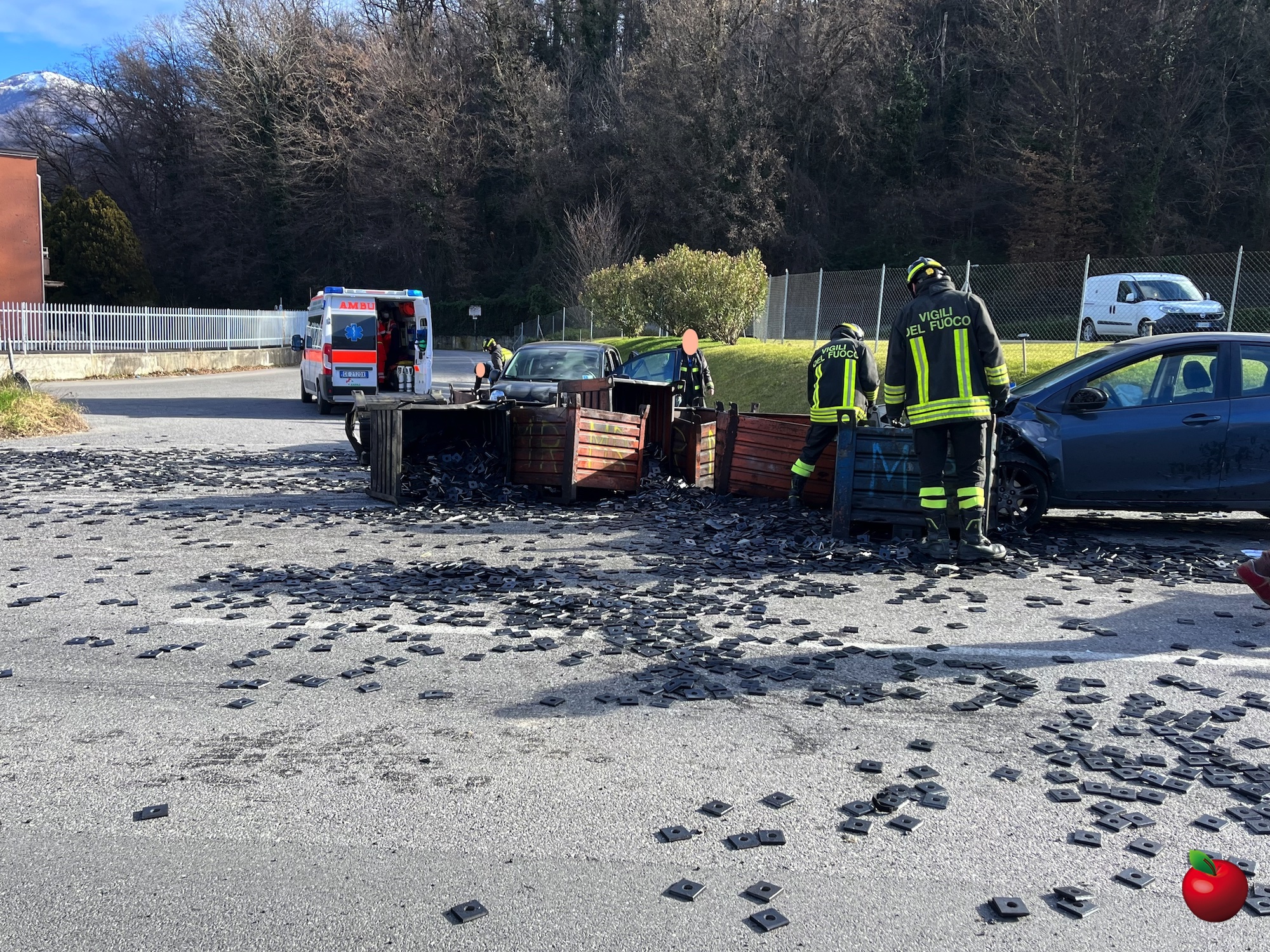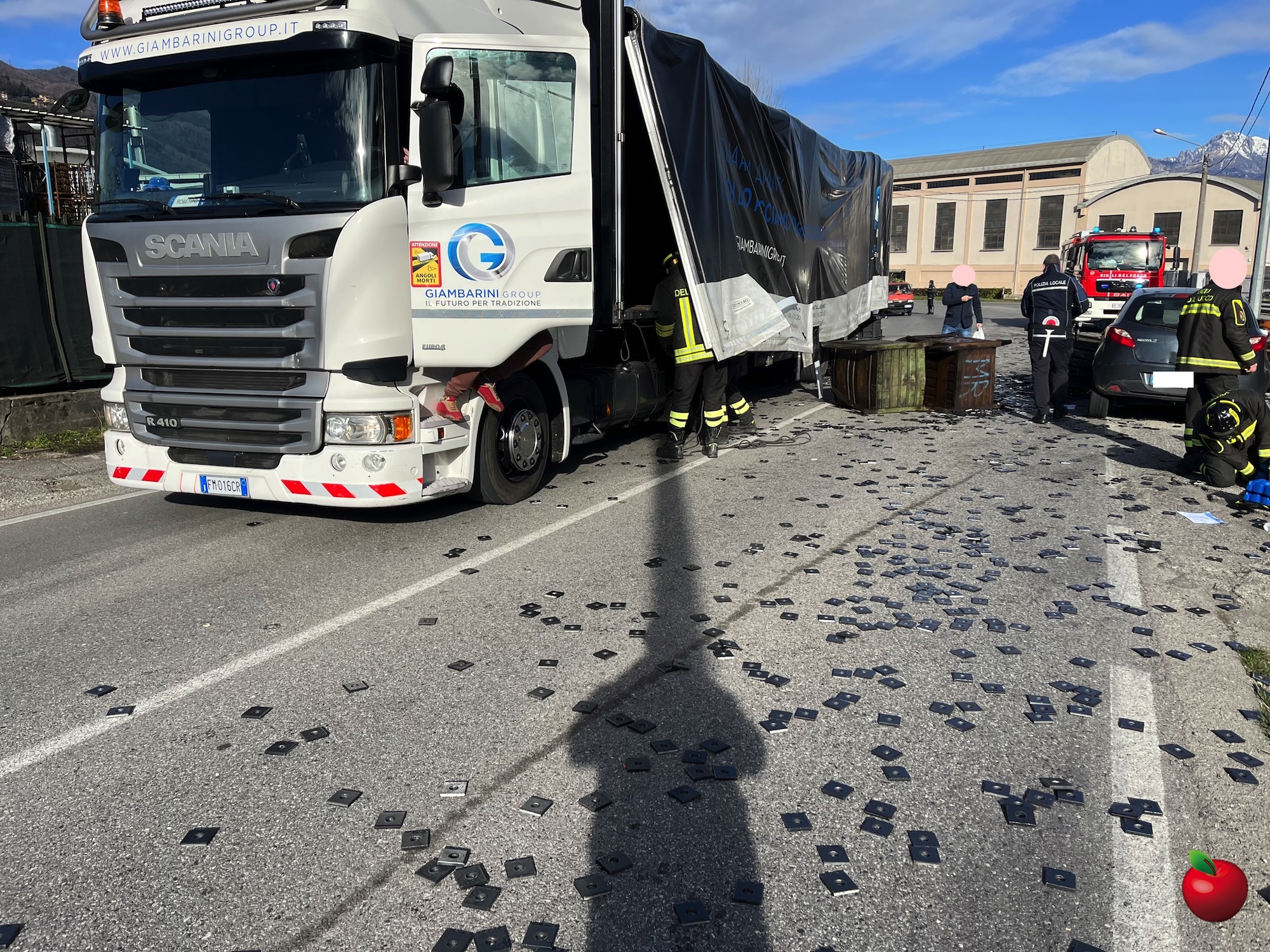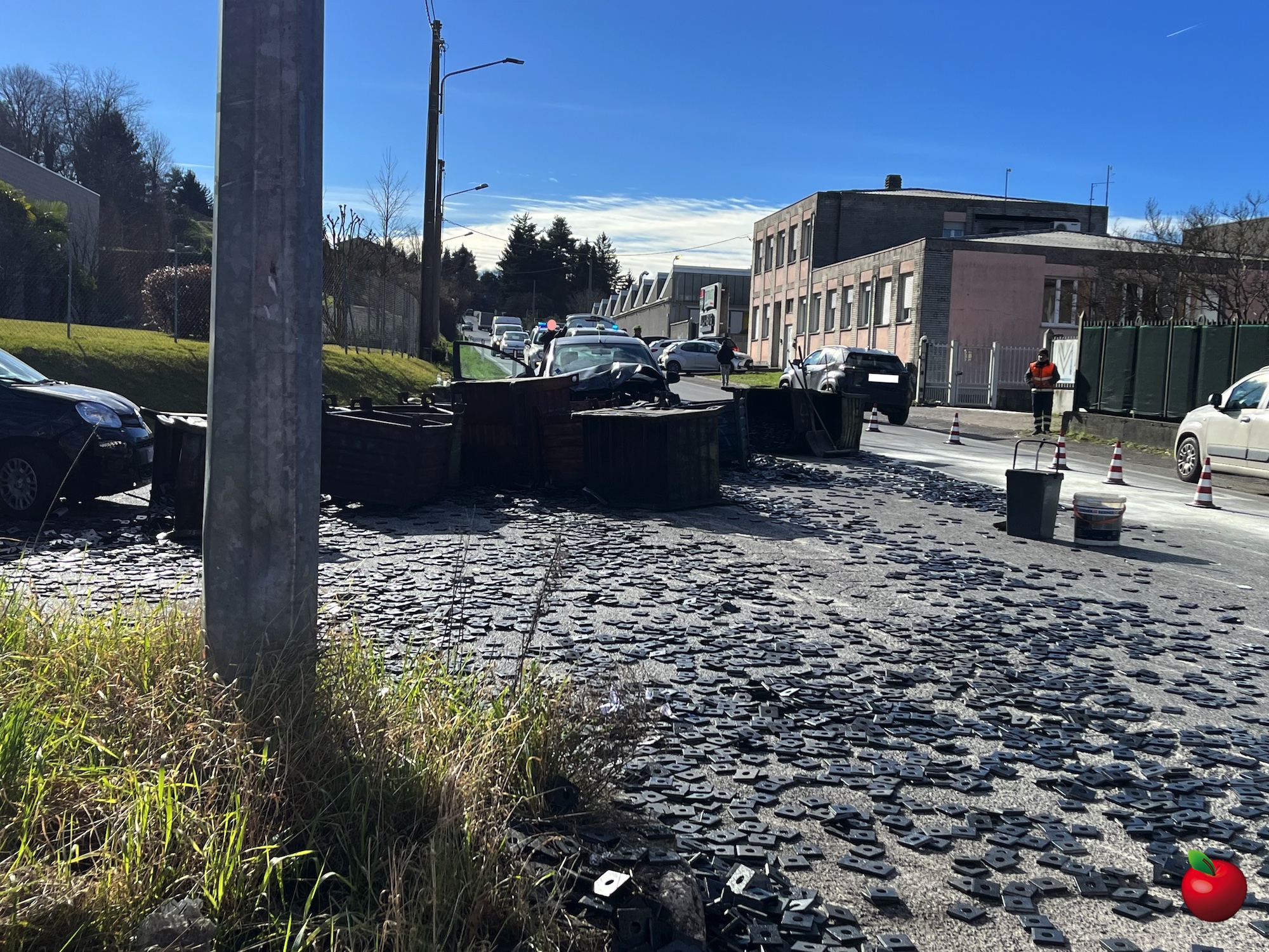 Un camion che procedeva in salita, carico di cassoni in ferro con minuteria metallica, per cause da accertare ha perso il materiale che si è scaricato così sulla strada.