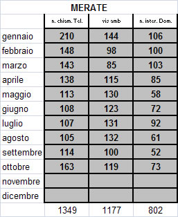 Ad 31 ottobre 2011, alla guardia medica di Merate, si sono rivolti 3328 persone, la maggior parte delle quali per una consultazione telefonica (1349). 1177 le visite ambulatoriali effettuate e 802 quelle invece a domicilio.