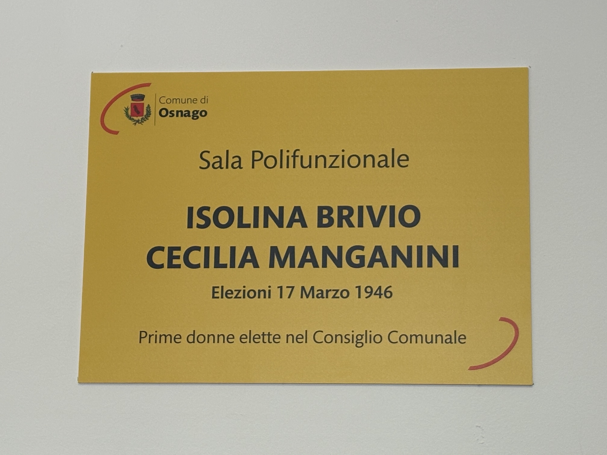 La mattinata si è aperta alle 10.30 in piazza Dante, con la posa di una targa e l’intitolazione della Sala Polifunzionale alle prime due donne elette nel consiglio comunale di Osnago il 17 marzo 1946: Isolina Brivio e Cecilia Manganini. A ricordarne la storia e il percorso di vita sono state le nipoti, Carla Villan e Miriam Lucia Pirovano, che hanno condiviso con i numerosi presenti ricordi familiari e frammenti di vita delle due figure.