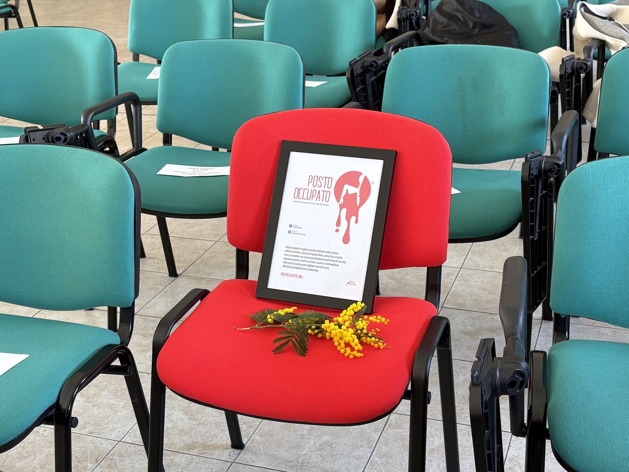 Tra le numerose poltrone verdi della sala spiccava una sola poltrona rossa, sulla quale è stata collocata una targa con una scritta che racchiude il senso dell'iniziativa: “Posto occupato è un gesto concreto dedicato a tutte le donne vittime di violenza. Ciascuna di quelle donne, prima che un marito, un ex, un amante, uno sconosciuto decidesse di porre fine alla sua vita occupava un posto a teatro, sul tram, a scuola, in metropolitana, nella società. Questo posto vogliamo riservarlo a loro affinché la quotidianità non lo sommerga.”