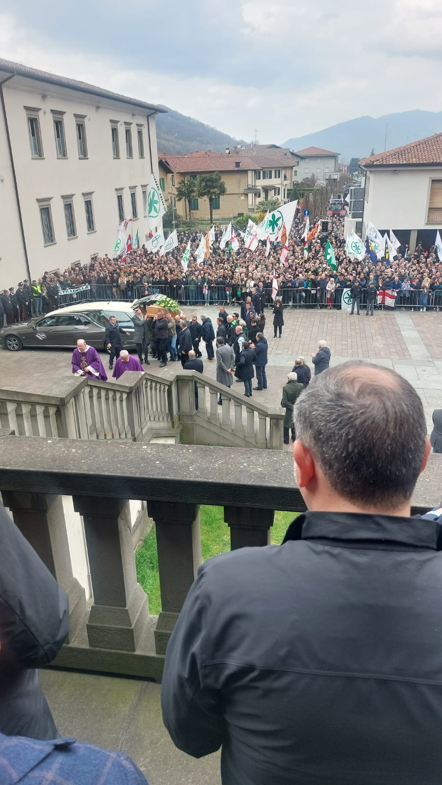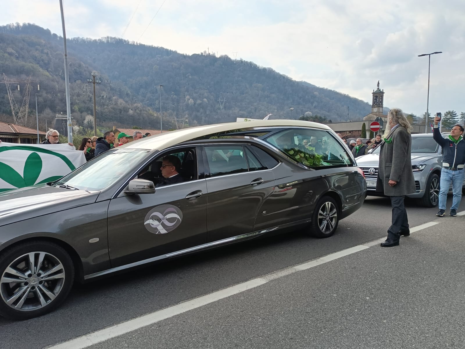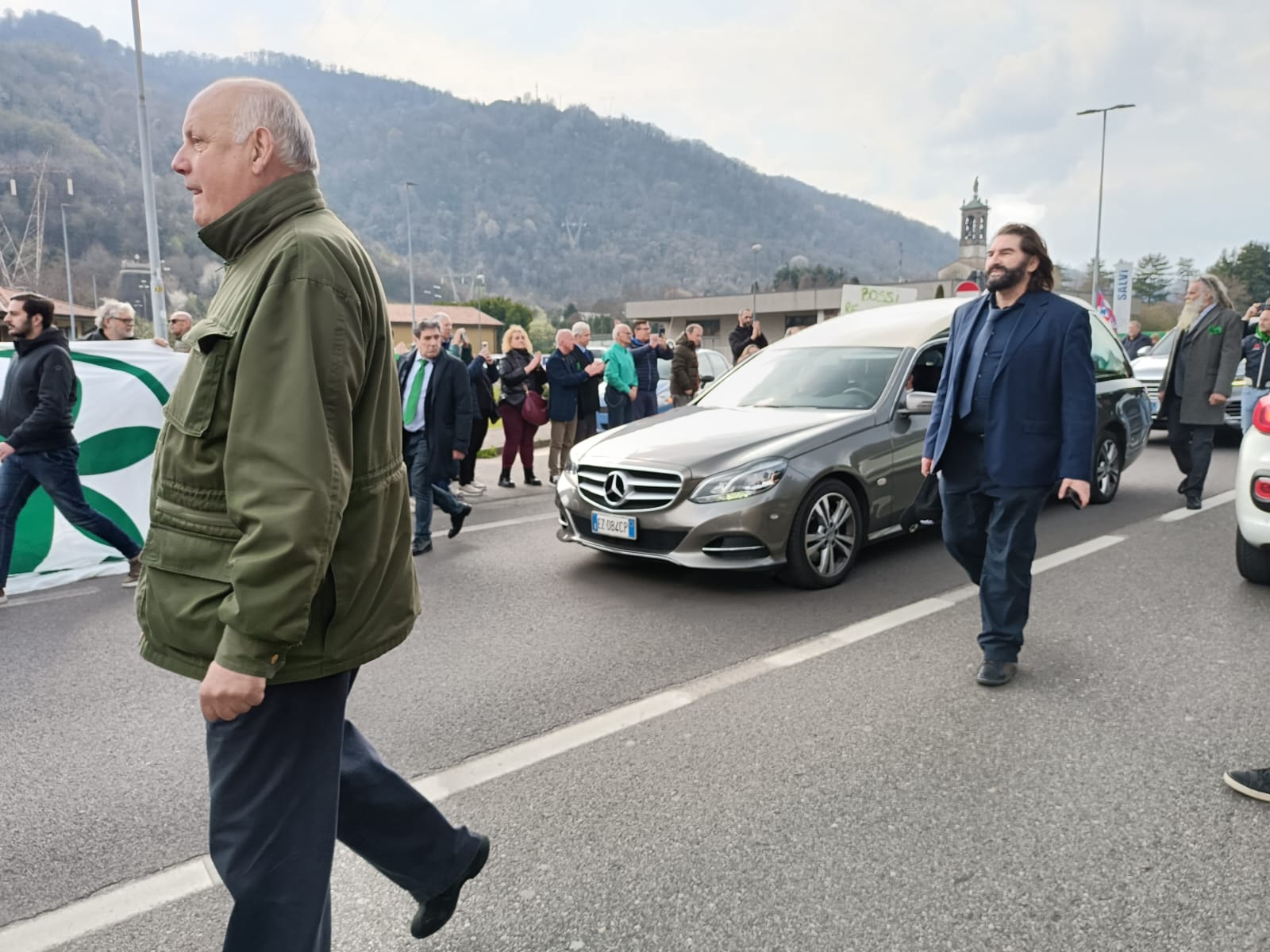 Al termine della funzione religiosa, il feretro esce dall’abbazia e parte il Va, pensiero, intonato dal coro degli alpini: i presenti iniziano a cantare, con una forza che si fa sentire. Molti presi dalla emozione seguono sottovoce, altri restano in silenzio. È il momento in cui tutto si ferma davvero. Poi il feretro si muove dall’abbazia verso il prato di Pontida, a poche centinaia di metri. Ai lati si aprono due ali di folla compatte e al suo passaggio partono applausi convinti, continui. Le mani battono all’unisono, accompagnando ogni metro di quel tragitto. È un percorso breve, ma carico di significato, per l’ultimo omaggio del suo popolo al suo capo.