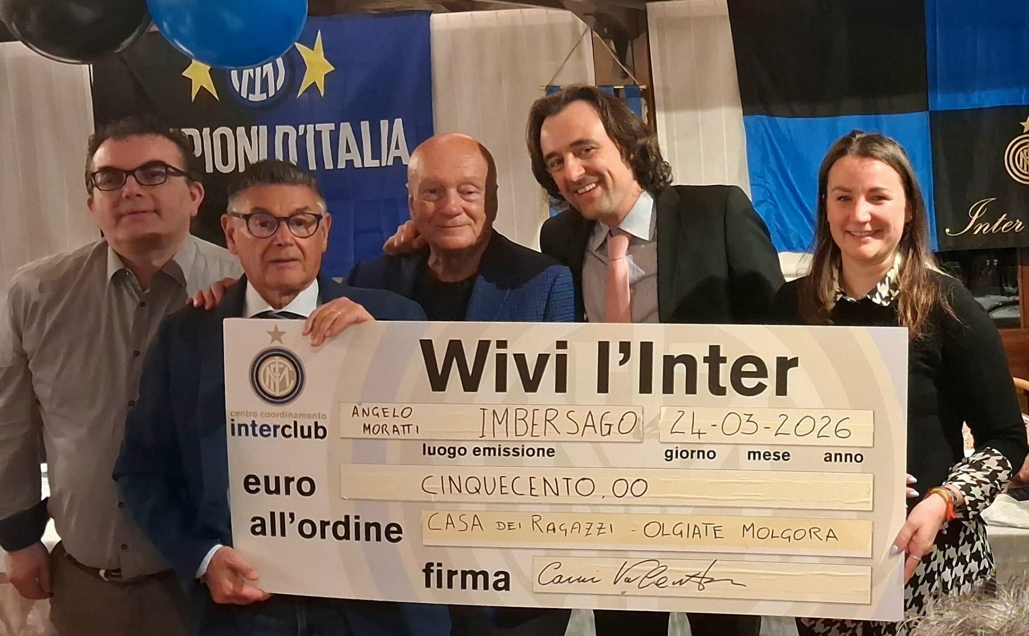 Tra gli ospiti della serata presenti anche il dottor Lorenzo Guzzetti, direttore generale di Casa dei Ragazzi, e la dottoressa Clarissa Bassani, coordinatrice delle residenze per disabili. Accanto a loro il sindaco di Imbersago Fabio Vergani, l’opinionista calcistico di Telelombardia Giovanni Sandrè – noto come “Mr Millepanchine” – e i giovani Giorgia e Marco, rappresentanti del Centro di Coordinamento Inter Club.