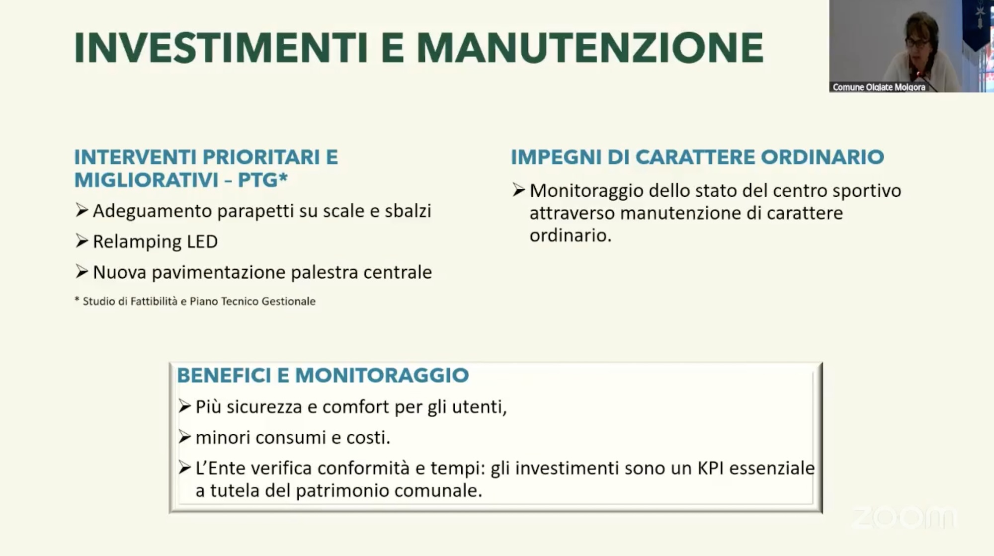 Il nuovo gestore, infatti, dovrà farsi carico di tre investimenti importanti sul Centro: la sostituzione di tutte le lampade introducendo il led, il rifacimento della pavimentazione della palestra centrale e l’installazione di parapetti su scale e sbalzi. Il costo di questi tre interventi è stato stimato in circa 183.000 euro. Anche per questo motivo si è ritenuto di affidare il Centro per 15 anni: per dare il tempo di fare gli interventi.