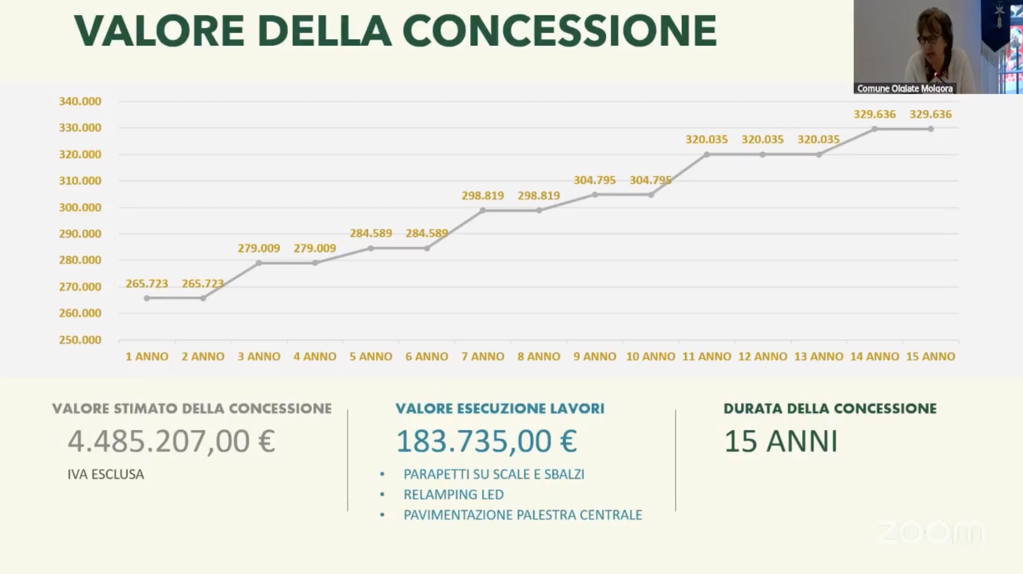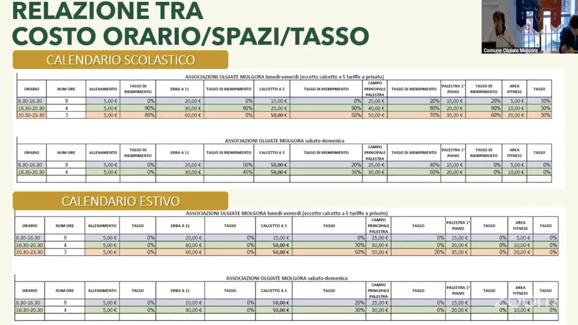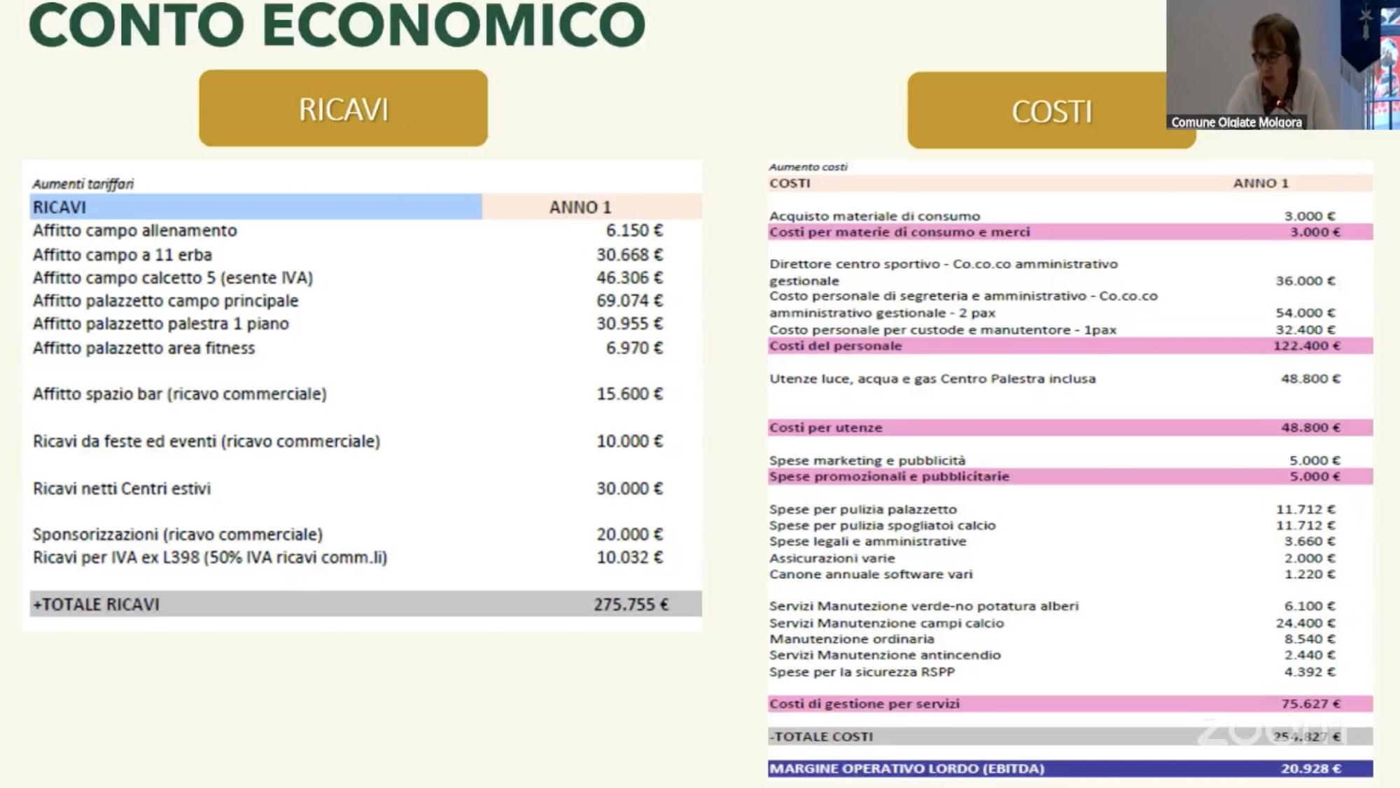 Il valore della concessione per 15 anni è stato stimato in 4.485.207 euro, iva esclusa. L’assessore Colombo ha proiettato una presentazione con anche una tabella con i calcoli eseguiti. Solo per il primo anno, il gestore potrebbe ricavare 275.755 euro tra affitti dei campi da gioco, del bar, delle varie aree del palazzetto, dalle feste e gli eventi, e dalle settimane dei Centri estivi. Per contro, i costi di gestione sono stati stimati in 254.827 euro, dunque con un margine operativo lordo di quasi 21.000 euro. Tra i costi – e qui sta la novità – sono già stati compresi anche gli stipendi per il personale: direttore del centro sportivo, segreteria e amministrazione, custodi e altre figure ancora. Una voce che, quando c’erano i volontari, non era presente.