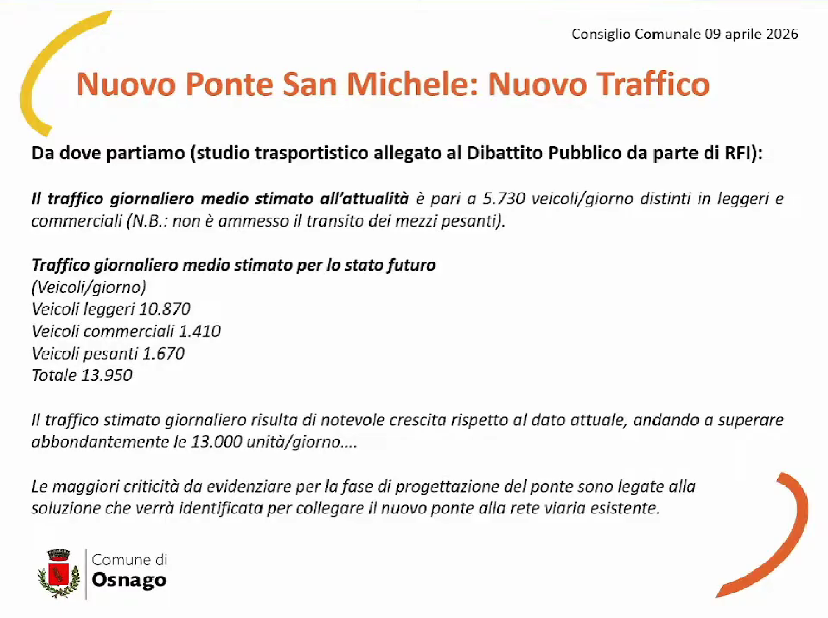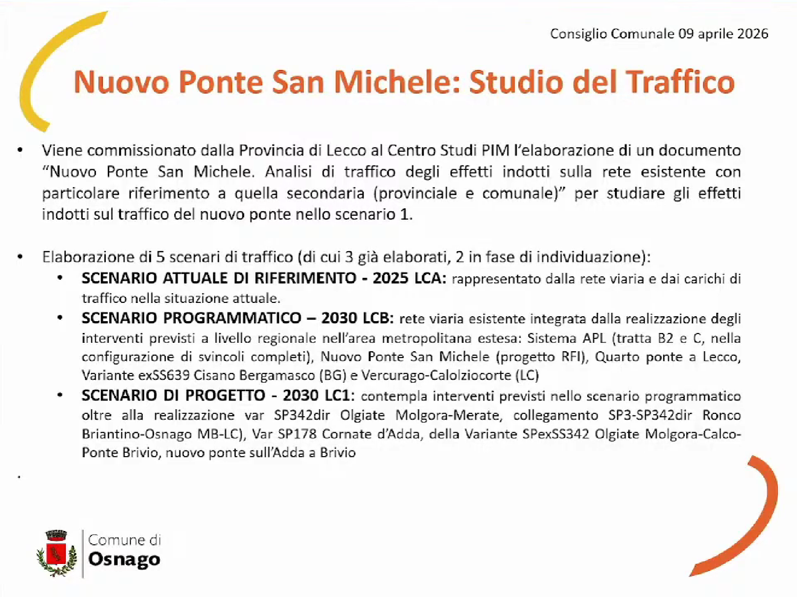 Il momento più atteso è stato l’approfondimento sulle analisi del traffico indotte dalla chiusura e ricostruzione del Ponte San Michele, prevista per il 2030. Il sindaco Rocca ha dipinto uno scenario inquietante: RFI stima un passaggio da 5.730 a oltre 13.000 veicoli al giorno, di cui molti mezzi pesanti oggi vietati. Osnago rischia la paralisi. Lo studio affidato al Centro Studi PIM evidenzia che, senza interventi, la velocità media nell'ora di punta scenderà a livelli minimi. La soluzione chiave per il territorio sarebbe la realizzazione della "tangenzialina" Ronco-Osnago (collegamento SP3-SP342), un’opera pensata nel 2006 e mai realizzata, che ridurrebbe del 75% il traffico alla rotonda del Decathlon. Il dibattito è stato rovente: Riva ha accusato la maggioranza di non avere un'alternativa concreta al progetto di RFI, mentre il Sindaco ha ribadito l'adesione al comitato che chiede di spostare il ponte stradale più a sud per salvare il paesaggio dell'Adda e il riconoscimento UNESCO.