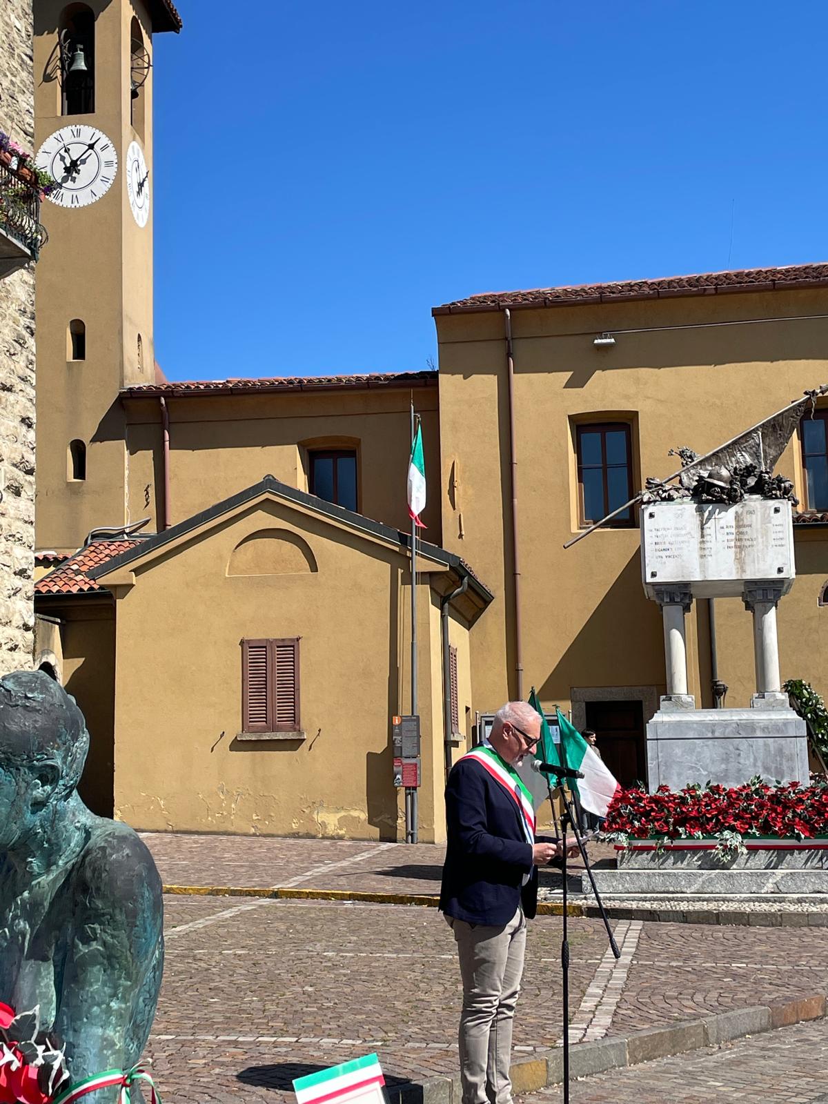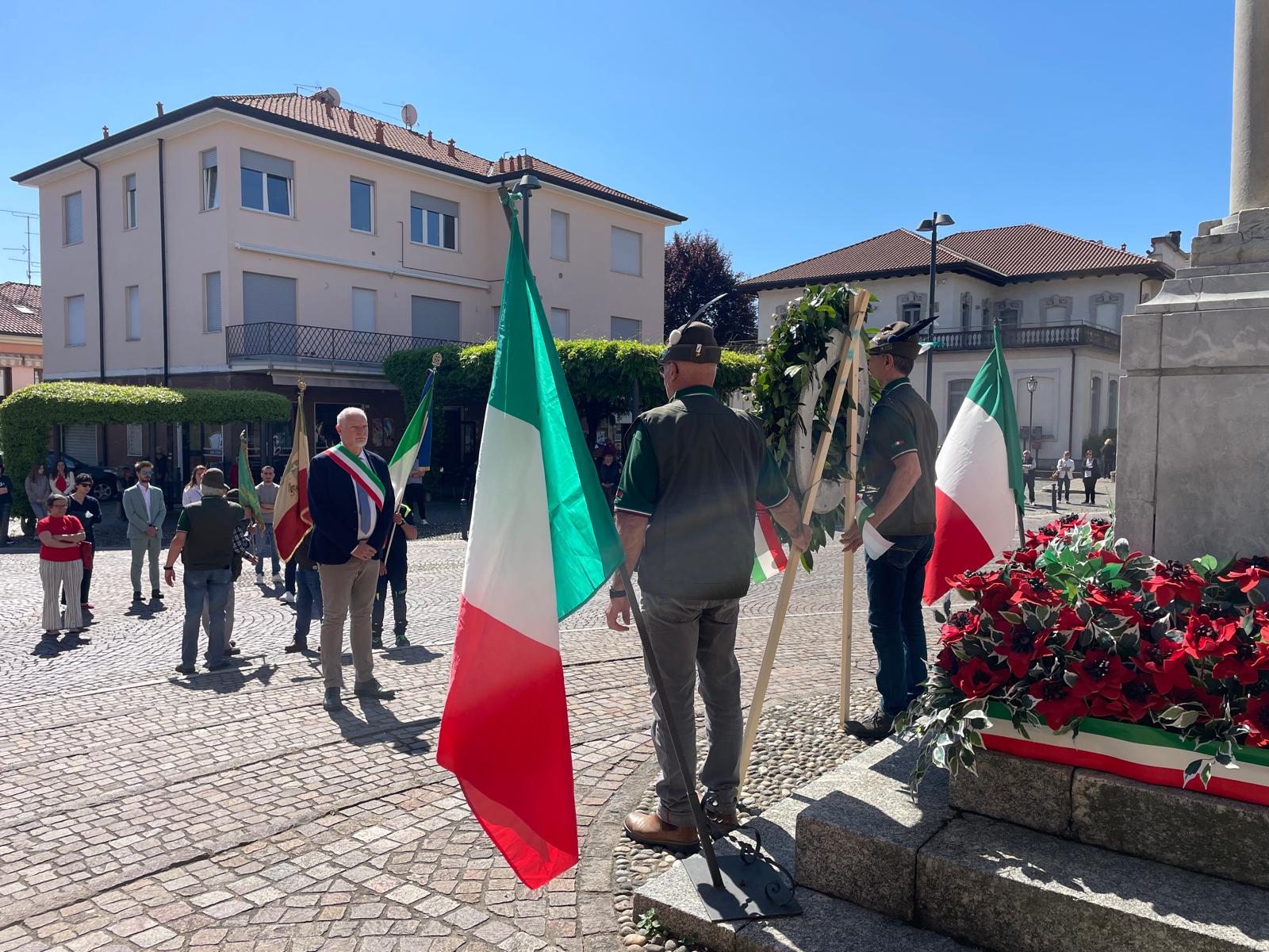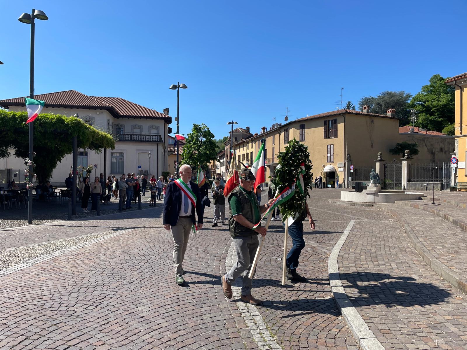 Alcuni membri dell'Amministrazione, accompagnati dagli Alpini e la Protezione Civile hanno deposto la corona d'alloro, per poi lasciare spazio al consueto discorso del sindaco Fabio Vergani.