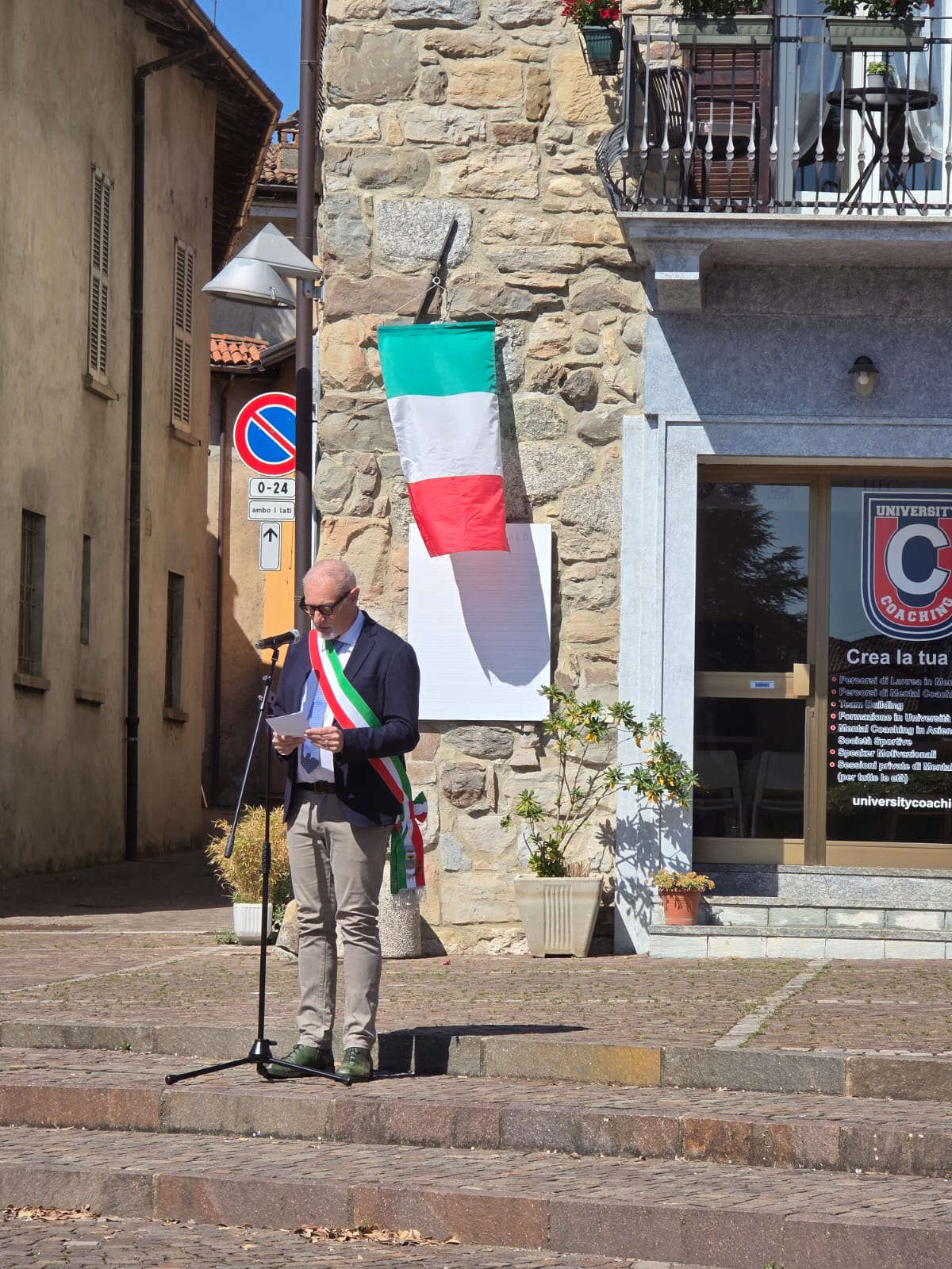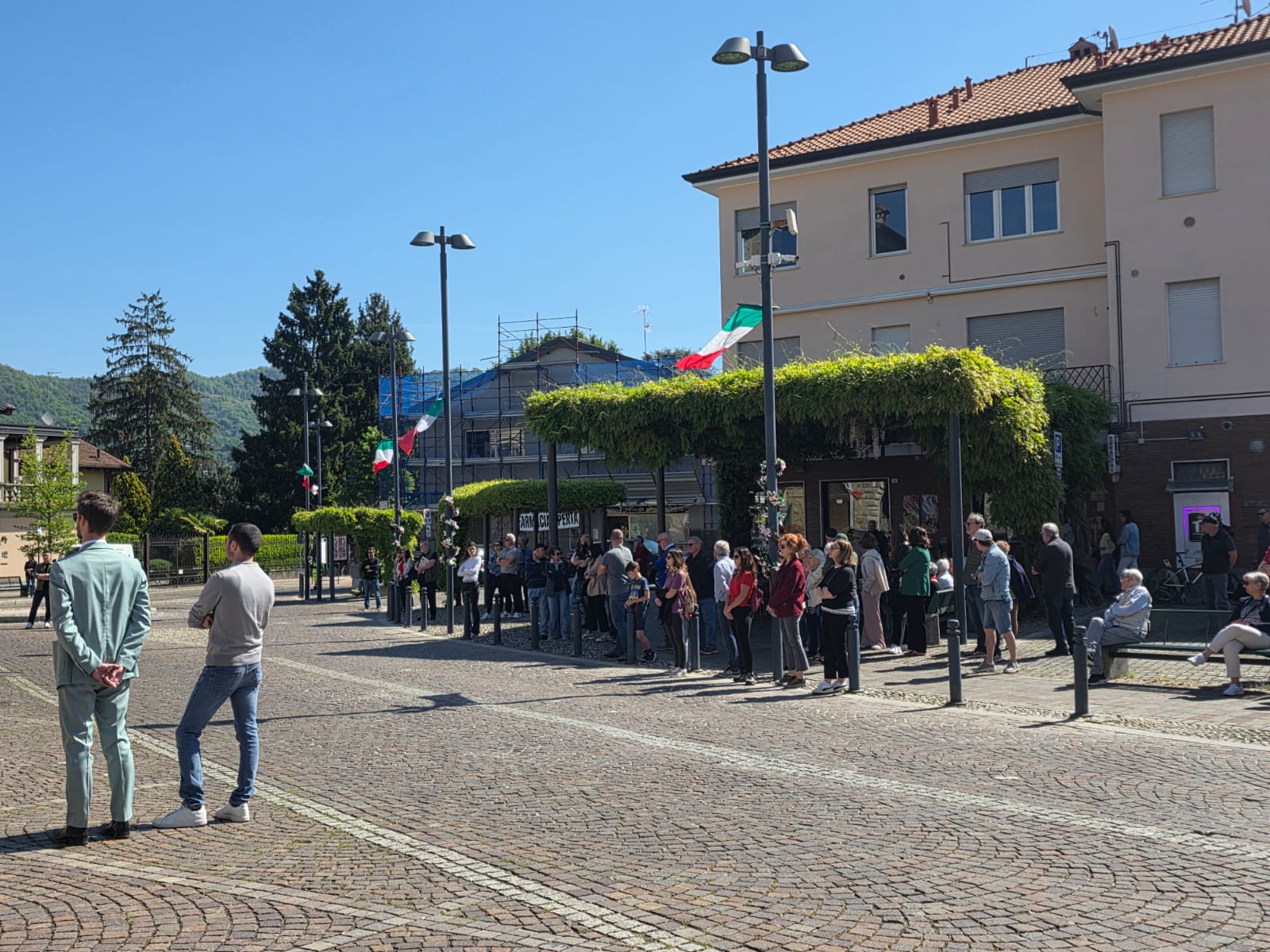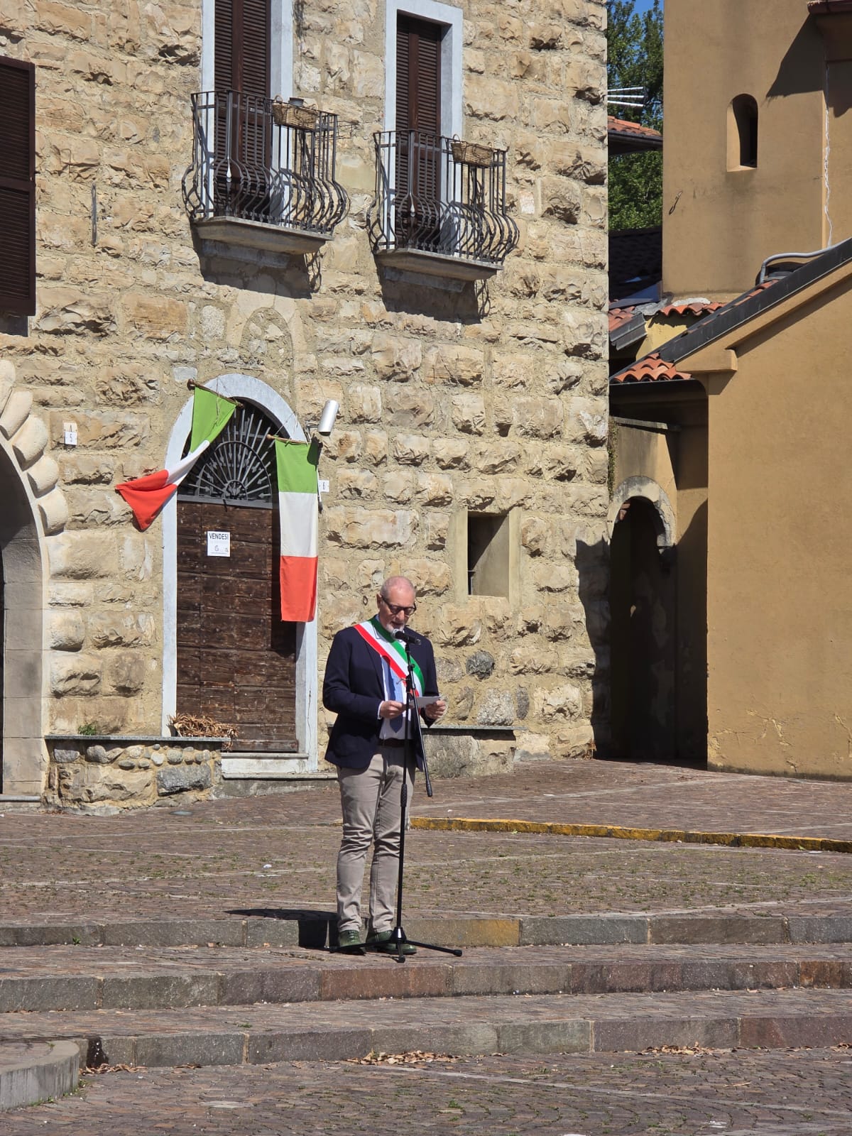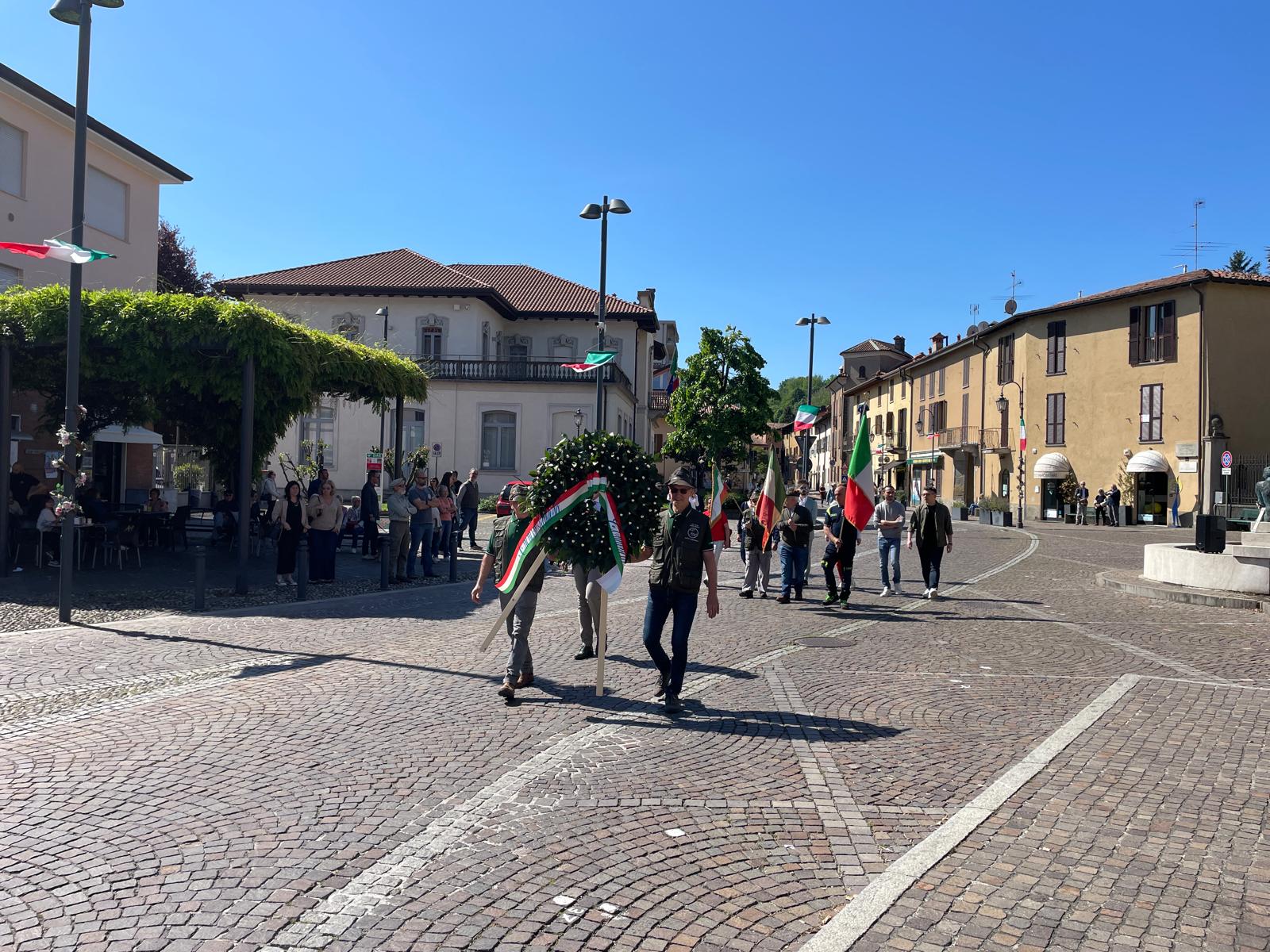 Alcuni membri dell'Amministrazione, accompagnati dagli Alpini e la Protezione Civile hanno deposto la corona d'alloro, per poi lasciare spazio al consueto discorso del sindaco Fabio Vergani.