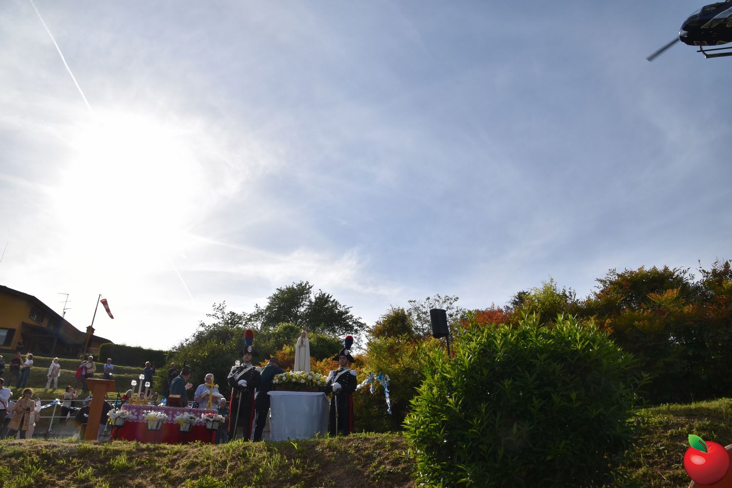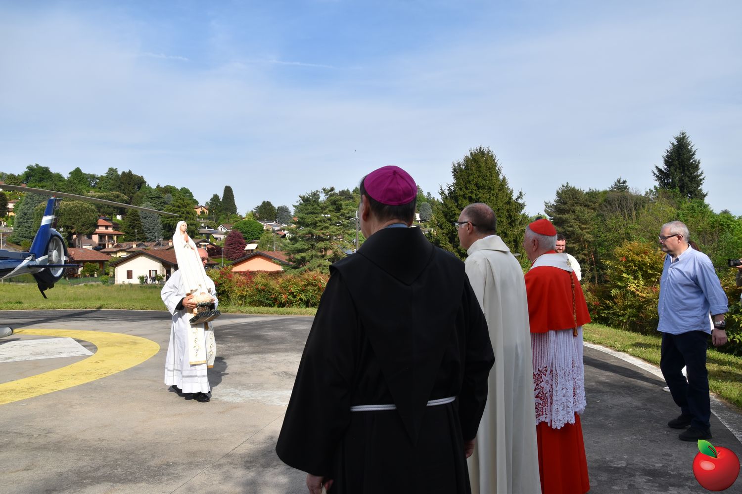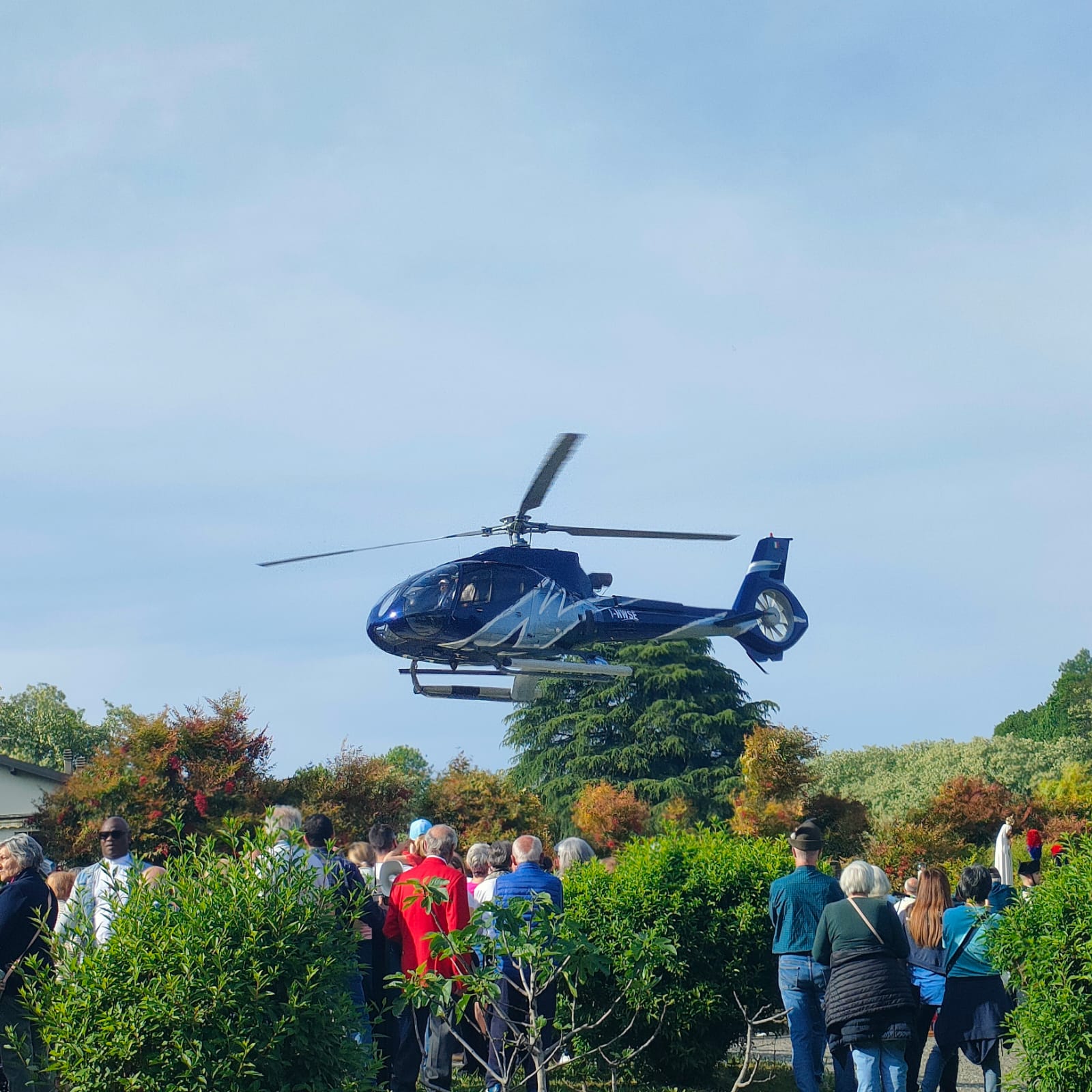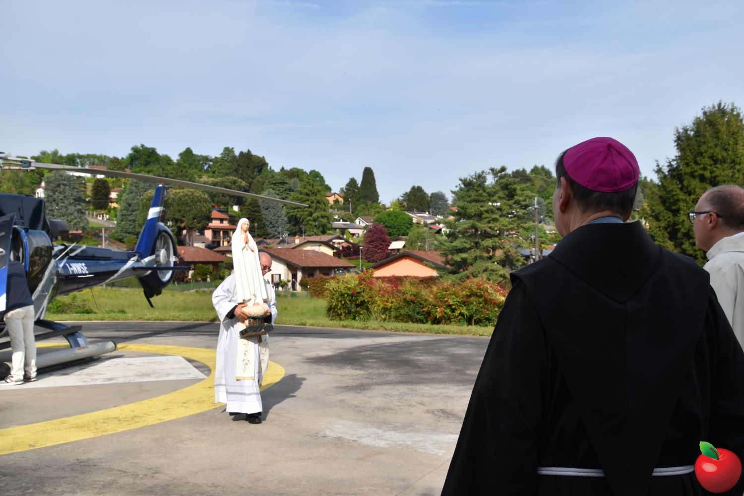 “Non abbiate paura, non vi farò del male. Vengo dal cielo”. È sembrato rievocare le parole pronunciate da Maria alla sua apparizione ai tre pastorelli l'arrivo a Merate della Madonna Pellegrina di Fatima, giunta su un elicottero domenica pomeriggio, atterrato all'ospedale San Leopoldo Mandic. Centinaia di volti all'insù e sguardi di stupore hanno accolto don Mauro Malighetti, che da Introbio ha trasportato la statua per portarla fra i suoi parrocchiani in festa, riuniti nell'area posteriore del nosocomio per celebrare la Vergine: al momento dell’atterraggio, una distesa di fazzoletti bianchi si sono levati nell’aria, sventolati dai presenti in segno di saluto e devozione, mentre don Mauro è sceso tra la folla, portando la statua tra i fedeli per un primo, intenso momento di adorazione.