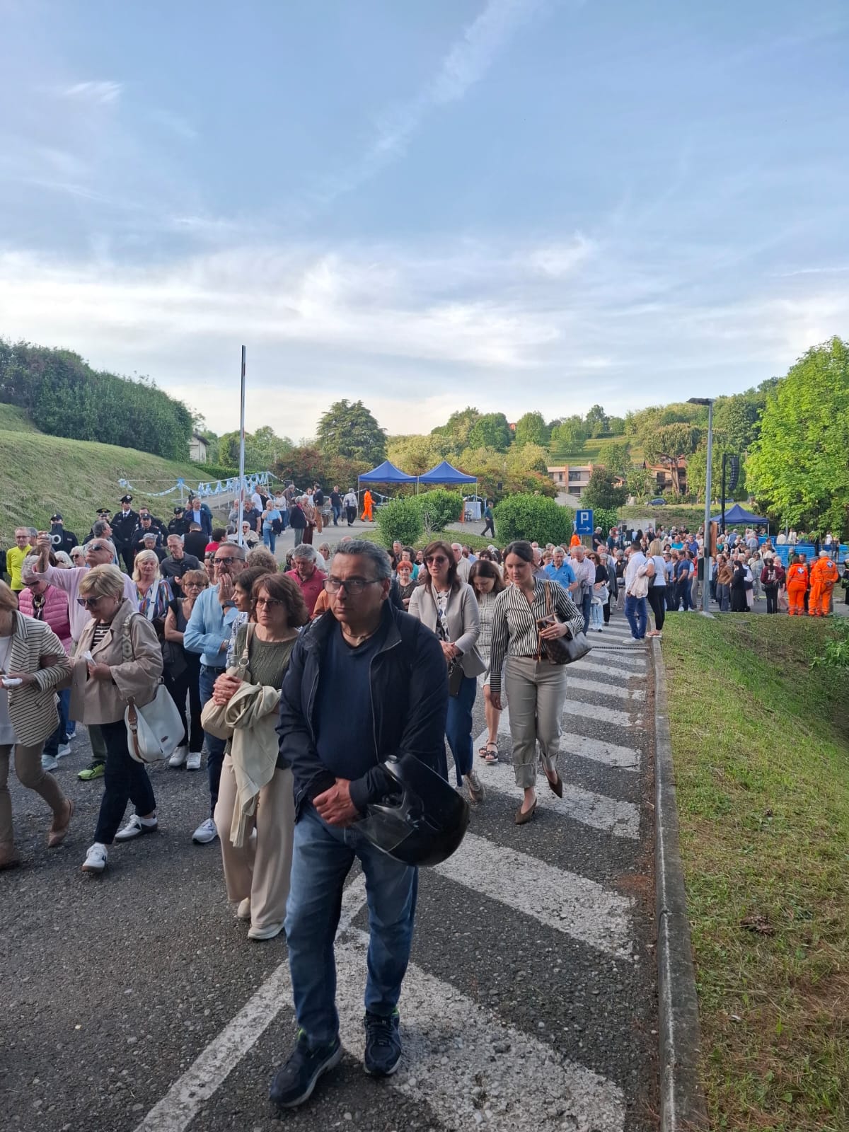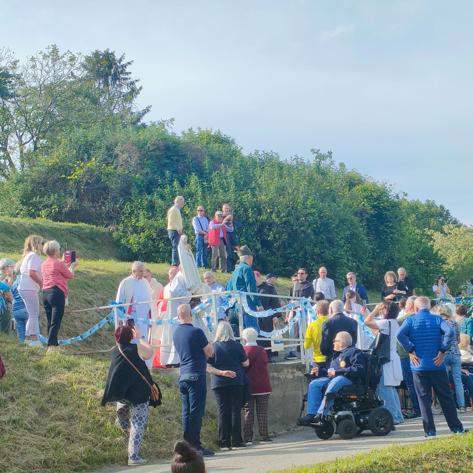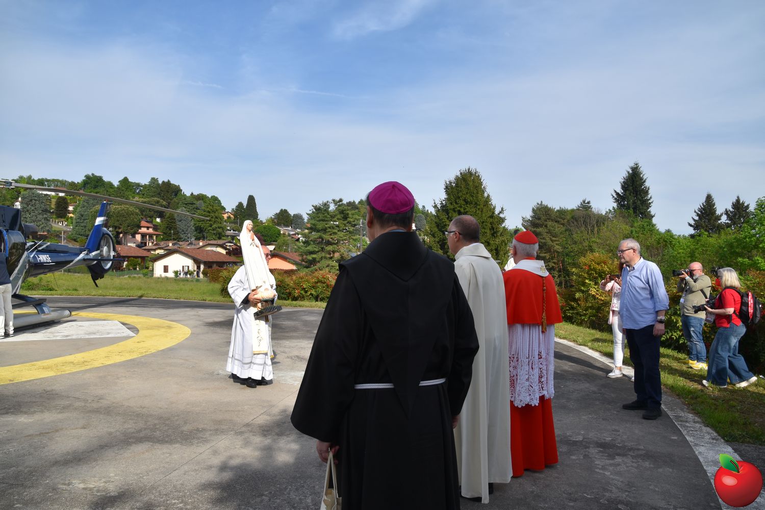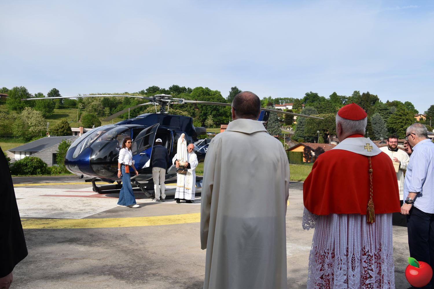 “Non abbiate paura, non vi farò del male. Vengo dal cielo”. È sembrato rievocare le parole pronunciate da Maria alla sua apparizione ai tre pastorelli l'arrivo a Merate della Madonna Pellegrina di Fatima, giunta su un elicottero domenica pomeriggio, atterrato all'ospedale San Leopoldo Mandic. Centinaia di volti all'insù e sguardi di stupore hanno accolto don Mauro Malighetti, che da Introbio ha trasportato la statua per portarla fra i suoi parrocchiani in festa, riuniti nell'area posteriore del nosocomio per celebrare la Vergine: al momento dell’atterraggio, una distesa di fazzoletti bianchi si sono levati nell’aria, sventolati dai presenti in segno di saluto e devozione, mentre don Mauro è sceso tra la folla, portando la statua tra i fedeli per un primo, intenso momento di adorazione.