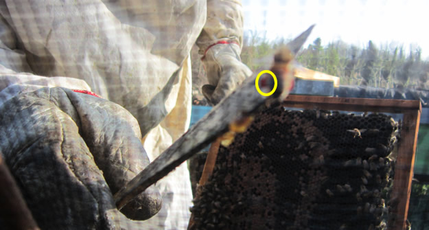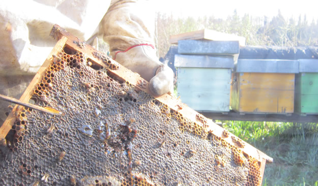 Un telaino opercolato: per arrivare al miele bisogna eliminare lo strato di cera che tappa i favi