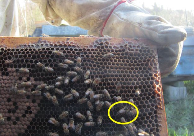 Nel tondo l’ape regina: il suo addome decisamente più allungato rispetto alle operai permette di riconoscerla nel gruppo