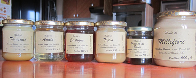 I sei diversi tipi di miele prodotti dalle api del signor Ravasi durante una stagione di lavoro