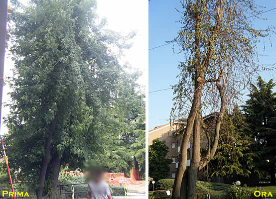 Vi scrivo per raccontarvi la mia storia di sfortunato albero piantumato nel giardino di un condominio sperando che qualcuno possa ancor salvarmi. Sono un acero nocerino che ha dimora in questo giardino da ben più di trent'anni. Ho donato per tanti anni ossigeno, frescura e bellezza senza chiedere niente in cambio. Sfortunatamente solo da qualche anno qualcuno si è accorto che ho un difetto: faccio ombra! Così, negli anni scorsi, è stato chiesto direttamente al giardiniere di "amputarmi" tutti i rami piccoli e grandi, tant'è che sono salito alla ribalta della cronaca direttamente sul periodico del Comune del mio paese proprio come scempio di potatura da non imitare. Per mia fortuna la natura è generosa e, malgrado l'orrenda potatura, ho continuato a fiorire ad ogni primavera. Non contenti della situazione poichè nei mesi estivi i miei rami ricchi di foglie facevano un po' di ombra, lo scorso anno, è stato chiesto il mio abbattimento. Fortunatamente, il buon senso ha prevalso è così mi è stata evitata questa fine. La primavera è tornata e anche quest'anno mi sono riempito di gemme e poi di foglioline verdi. Qualcosa però recentemente è successo: la maggior parte delle foglioline verdi sono diventate nere e sono diventati neri anche i rami più alti. Le gemme sono morte e così le foglioline verdi. Forse la mano dell'uomo, o la natura, hanno definitivamente spezzato la mia vita: alla mia base è evidente una "bruciatura" del terreno provocata da qualcosa che mi è stato forse versato sulle radici, tant'è che anche l'erbetta circostante è morta. Certo, se fosse stata la mano dell'uomo a provocare questo, rimango senza parole davanti alla cattiveria umana. Stupito dalla incredibile spietatezza delle persone. Sconcertato dalla perfidia di alcuni. Vi allego la foto della mia orrenda potatura, la foto di quando ero bello e pieno di foglie, la foto di come sono adesso e la foto della mia base dove si vede che qualcosa è successo (forse è stato buttato qualcosa sul terreno) sperando che qualcuno possa ancora salvarmi.