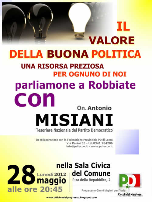 Lunedì 28 maggio alle ore 21 nella sala civica di Robbiate, ci sarà una serata con l'onorevole Antonio Misiani, tesoriere nazionale del partito democratico.
