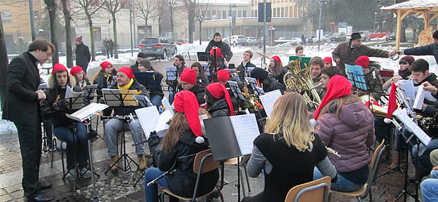 Hanno sfidato il freddo, l'umidità, le dita intirizzite che chiedevano di tornare presto nel caldo delle tasche per regalare un'ora di musica in piazza con melodie di Natale, alcune arrangiate altre tradizionali, che sono riuscite a scaldare l'atmosfera nonostante la piazza non pullulasse di gente.