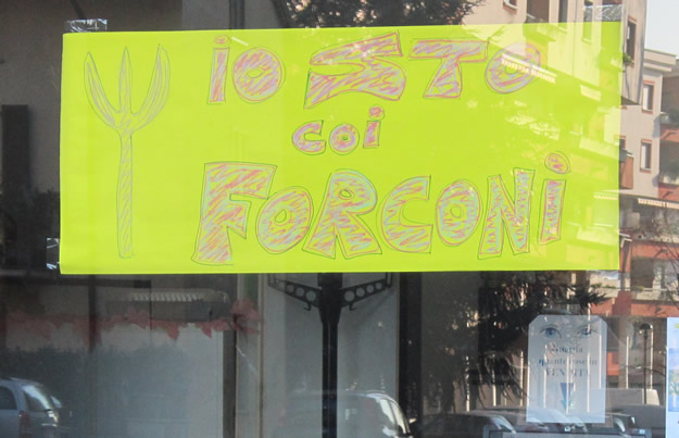Terzo giorno di mobilitazione per il Movimento dei Forconi. E la protesta arriva, seppur al momento solo simbolicamente, anche nel meratese. Ad Osnago, sulla vetrina di un’attività commerciale di via Trieste è infatti comparso una cartellone giallo con un “messaggio” chiaro e esplicito: “io sto con i forconi”. Adesione piena, seppur come dicevamo “pacifica” e solo dimostrativa, alla protesta sostenuta dai rappresentanti del “Comitato 9 dicembre” e da quanti, agricoltori, studenti, “scontenti” e disoccupati in primis, ma anche ultras e rappresentanti di gruppi estremisti, stanno manifestando la propria contrarietà al Governo e, più in generale, alla politica sentita come lontana dalle istanze che, fomentate dagli effetti sempre più evidenti della crisi, vengono sollevate dalla base, ormai esasperata. Se quindi nelle principali città da Nord e Sud, da domenica notte, si “alimenta” la protesta, con blocchi e cortei pacifici ma anche con manifestazioni di piazza e scontri in alcuni casi violentissimi come quelli verificatisi a Torino, ad Osnago un cartello scritto a pennarello ricorda come anche nella Brianza lecchese, sempre meno florida, ci sia qualcuno che non ne può davvero più di come “girano le cose”. Già da tre giorni, in concomitanza con le prime “uscite” nazionali, anche nella vicina Monza, un presidio permanente di manifestanti identificati sotto l’etichetta “cittadini italiani stanche di essere derubati dal governo illegale”, blocca il traffico lungo viale Stucchi, una delle strade principali della città. Il gruppo, nato con il passaparola e sui social network (sulla pagina Facebook campeggia la scritta: L’Italia si ferma dal 9 dicembre 2013. Ci hanno accompagnati alla fame, hanno distrutto l’identità di un paese, hanno annientato il futuro di intere generazioni), non ha intenzione di mollare. E intanto, i giornali nazionali, continuano a riferire di nuove iniziative (alle volte degenerate anche in veri e propri atti intimidatori nei confronti dei commercianti e provocazioni violente nei confronti delle forze dell’ordine) lungo tutto lo Stivale.