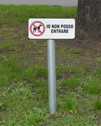 Poi c'è la questione della scelta lessicale. Al cane viene intimato di non entrare. E cosa diciamo al bambino con cagnolino che, rivolto al papà, chiede " ma papà dov'è la porta"? Vagli a dire che il vocabolario della lingua italiana è estensivo e che con il verbo entrare intende dire cose un pochino più complicate come "passare entro", "andare all'interno", "entrare addentro", "penetrare", "profondarsi". Il bambino memore di quanto gli insegnano a scuola sarà sempre portato, dove c'è un'entrata, a cercare un'uscita. Infine c'è la questione della posizione del cartello che la mano pubblica non ha posto all'altezza del bordino che fa da perimetro alle due grandi aiuole, ma al centro del tappeto verde.