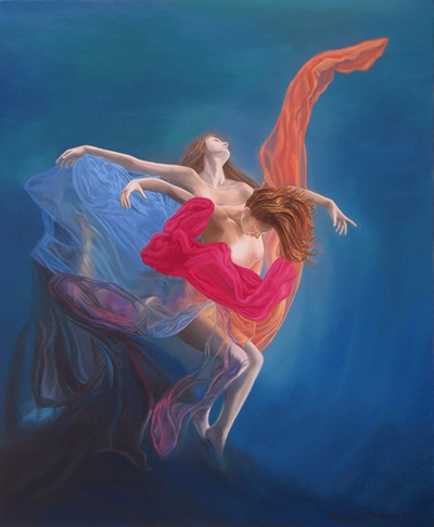 I dipinti di Franco Farina sembrano uscire dall'anima. Figure eteree, perse nell'infinito. Qui si possono vedere due "sé", sopra il punto vita, dove sta il cuore; si possono scorgere ben due entità, una che si dispera e una che vola, ma un unico corpo le sostiene. Una donna che ama è spesso lacerata dai dubbi, dalla passione e dalla razionalità, un conflitto continuo, anche se spesso, sappiamo bene che noi donne ci muoviamo con l'istinto e la passione.
