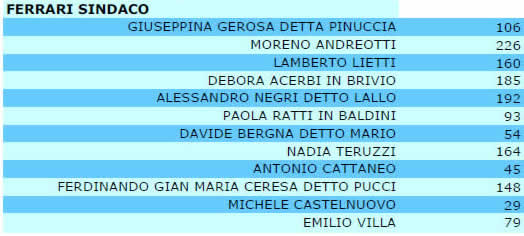 CANDIDATI CONSIGLIERI: Debora Acerbi, Moreno Andreotti, Davide Bergna, Michele Castelnuovo, Antonio Cattaneo, Ferdinando Gian Maria Ceresa, Giuseppina Gerosa, Lamberto Lietti, Alessandro Negri, Paola Ratti, Nadia Teruzzi, Emilio Villa.