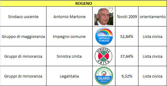 A ROGENO Antonio Martone è allo scadere del primo mandato. Nel 2009 la sua lista civica che guarda verso destra, aveva vinto sugli avversari Baruffini e Gilardi con il 52,84% dei voti.