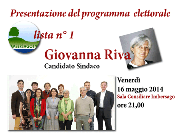 La lista elettorale guidata da Giovanna Riva, candidato sindaco per le prossime elezioni insieme a Giovanni Ghislandi e Valter Cogliati, si presenterà al pubblico la sera di venerdì 16 maggio alle ore 21.00, presso la sala consigliare del comune.