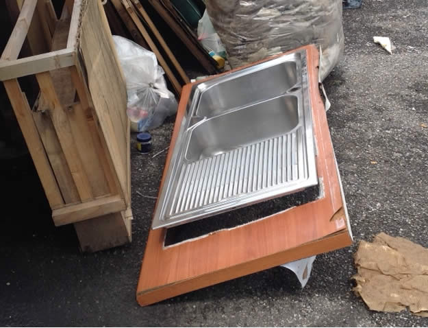 Una ruota completamente a terra, lo fa piegare sul lato del passeggero e attorno è un fiorire di schifezze: sacchi con vestiti, spazzatura varia, avanzi di cibo, giochi per bambini, una manichetta per l'idrante, cassette di legno, sacchi neri, poltrone, addirittura un lavandino.