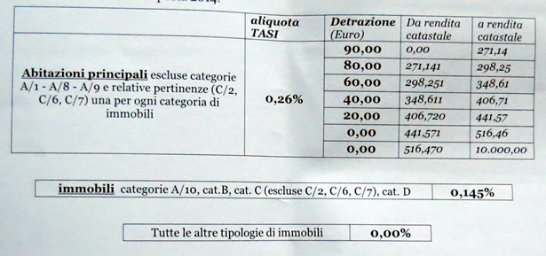 TASI: la tariffa sui servizi indivisibili prevede ad Airuno una aliquota dello 0,26%. L’aumento di un punto millesimale rispetto allo 0,25% indicato dal Governo come tariffa massima presuppone delle detrazioni in base alla rendita catastale, riassunte in questa tabella: