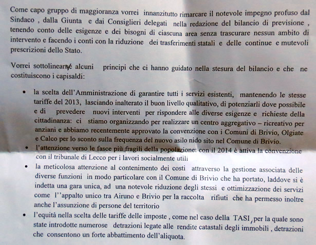 TARI: la tariffa per la raccolta e smaltimento dei rifiuti rimarrà sostanzialmente stabile per i cittadini, anche grazie ad un contenimento dei costi (10.000 € in meno) dovuto al convenzionamento del servizio con Brivio. La raccolta inoltre migliora con l’introduzione del vetro porta a porta (iniziata il 3 settembre). Il gettito previsto è pari a 260.00 €. L’acconto sarà da corrispondere entro il 15 novembre, il saldo entro il 15 febbraio 2015. Gli avvisi di pagamento saranno inviati dal comune.
