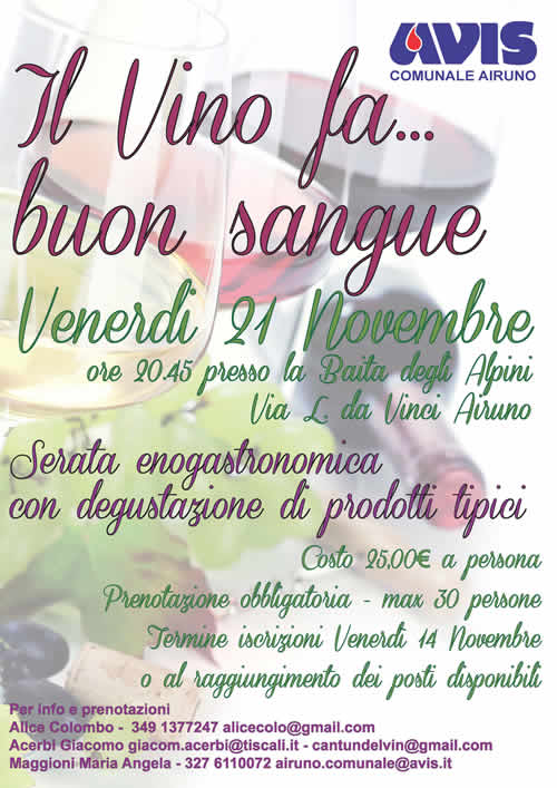 Venerdi 21 novembre ore 20.45 presso la "Baita degli Alpini" ad Airuno si terrà "IL VINO FA BUON SANGUE" serata di degustazione enogastronomica