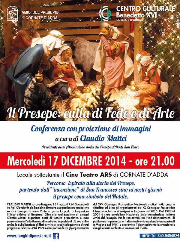 Il Centro culturale BENEDETTO XVI di Cornate d'Adda, in collaborazione con il gruppo degli "AMICI del PRESEPIO" di Cornate d'Adda organizza la seguente manifestazione: