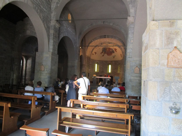 All'interno si può notare lo stile romano e un affresco danneggiato, in stile bizantino, raffigurante il Cristo Pantocrato.