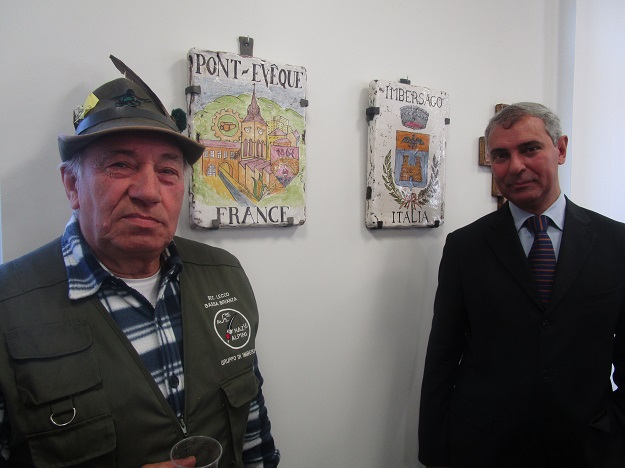 Un alpino con il sindaco Giovanni Ghislandi e alle spalle i simboli del gemellaggio