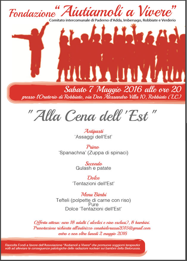 Sabato 7 maggio presso l'oratorio di Robbiate si svolgerà la “Cena dell'est” organizzata dalla fondazione Aiutiamoli a Vivere. Il momento conviviale sarà l'occasione per raccogliere fondi per promuovere soggiorni terapeutici volti ad alleviare le conseguenze patologiche delle radiazioni nucleari sui bambini della Bielorussia.