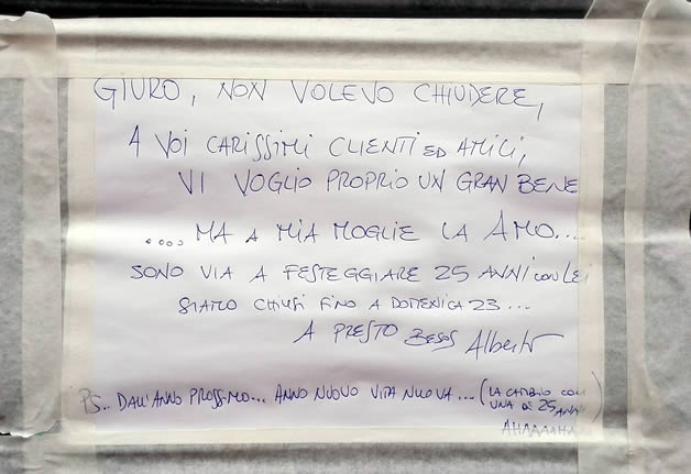 E infatti ai clienti che sono transitati in questi giorni per vedere il perchè della serranda abbassata, è bastato dare una lettura al cartello per avere la risposta, fare un sorriso di fronte alla simpatia del titolare ma anche compiacersi di un regalo che moglie e marito si sono concessi...pubblicamente. Per festeggiare i 25 anni di nozze, infatti, Albert ha scritto che la moglie viene prima di tutto e quindi una settimana tutta per lei non gliel'avrebbe tolta nessuno, nemmeno i suoi amati clienti. Detto fatto, la saracinesca è stata abbassata e il simpatico cartello è stata una dolce dichiarazione per la consorte...almeno per quest'anniversario perchè per il prossimo...