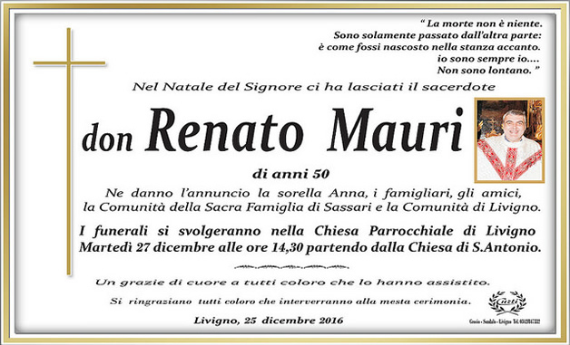 Don Renato Mauri, 50 anni, è spirato dopo una malattia che non gli ha lasciato scampo, a Livigno ultima sua parrocchia dove era stato destinato a esercitare il ministero. Qui nella giornata di martedì 27 dicembre, alle ore 14.30 si svolgeranno i funerali che precederanno la sepoltura nella medesima città. Don Renato, però, aveva nelle vene sangue meratese. Nato a Desio, era cresciuto a Pagnano, a Calco (paese dove il padre faceva il calzolaio) aveva frequentato le scuole medie, poi si era iscritto ai Salesiani di Sesto San Giovanni ed infine era entrato in seminario, con il sogno di diventare sacerdote missionario. Sogno avveratosi nel 1992 anno di consacrazione per mano dell'allora arcivescovo di Milano Carlo Maria Martini. In frazione aveva celebrato la prima Messa e poi era stato destinato nelle Filippine.