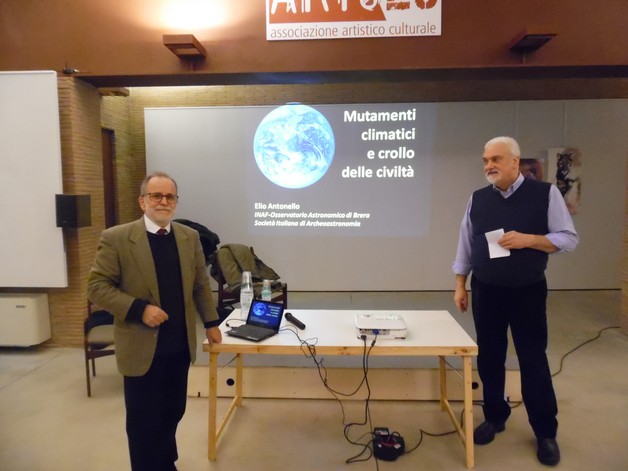 Relatore il prof. Elio Antonello, astronomo INAF e dell'osservatorio astronomico di Brera e presidente società italiana di archeoastronomia. Dopo un breve riassunto della precedente conferenza, nella quale l'astronomo aveva spiegato come l'aspetto climatico, regolato dall'astronomia, sia strettamente collegato all'evoluzione dell'uomo, si è passati subito a spiegare i vari andamenti climatici che si sono susseguiti durante la storia terrestre. «Dobbiamo anzitutto notare - ha esordito - che i deserti sono per la maggior parte posizionati nelle due fasce tropicali. Ora siamo in un periodo dove, tutto sommato, si sta bene. L'era glaciale è finita, ma dobbiamo ricordare che durante la fase successiva a questa vi fu un brusco crollo delle temperature detto younger dryas. Sono diverse le ipotetiche cause di questi avvenimenti: può essere stato causato sia da un blocco del conveyor belt oceanico, sia a causa di un impatto di una cometa o una meteora oppure a causa di vulcani. Con il proseguire del riscaldamento, inoltre, è aumentato il livello del mare di circa 20 centimetri l'anno: una parte del golfo Persico, ad esempio, prima dell'innalzamento era all'asciutto».