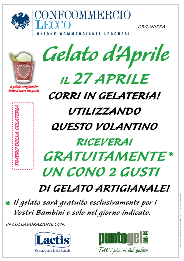 Torna giovedì 27 aprile, a partire dalle ore 15, l'iniziativa “Gelato d’aprile”, promossa da Confcommercio Lecco e organizzata da Cristina Valsecchi, presidente della Zona Valle San Martino di Confcommercio Lecco e gelatiera. Per l'ottava edizione sono stati consegnati circa 10 mila volantini: 16 le gelaterie aderenti, dislocate sul territorio da Colico a Brembate.