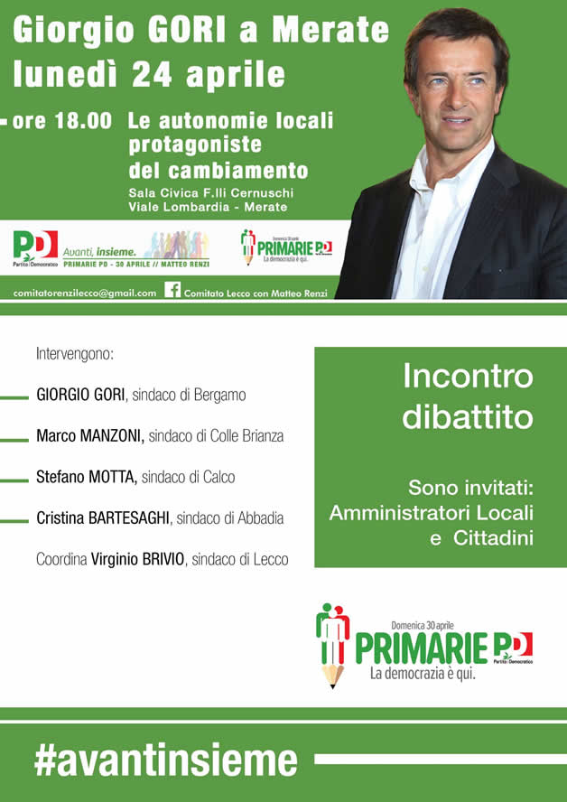 Infatti, lunedì 24 Aprile sarà ospite presso la Sala Civica "F.lli Cernuschi" a Merate Giorgio Gori, sindaco di Bergamo, che insieme ad altri amministratori del territorio dibatteranno sul tema "Le autonomie locali protagoniste del cambiamento".